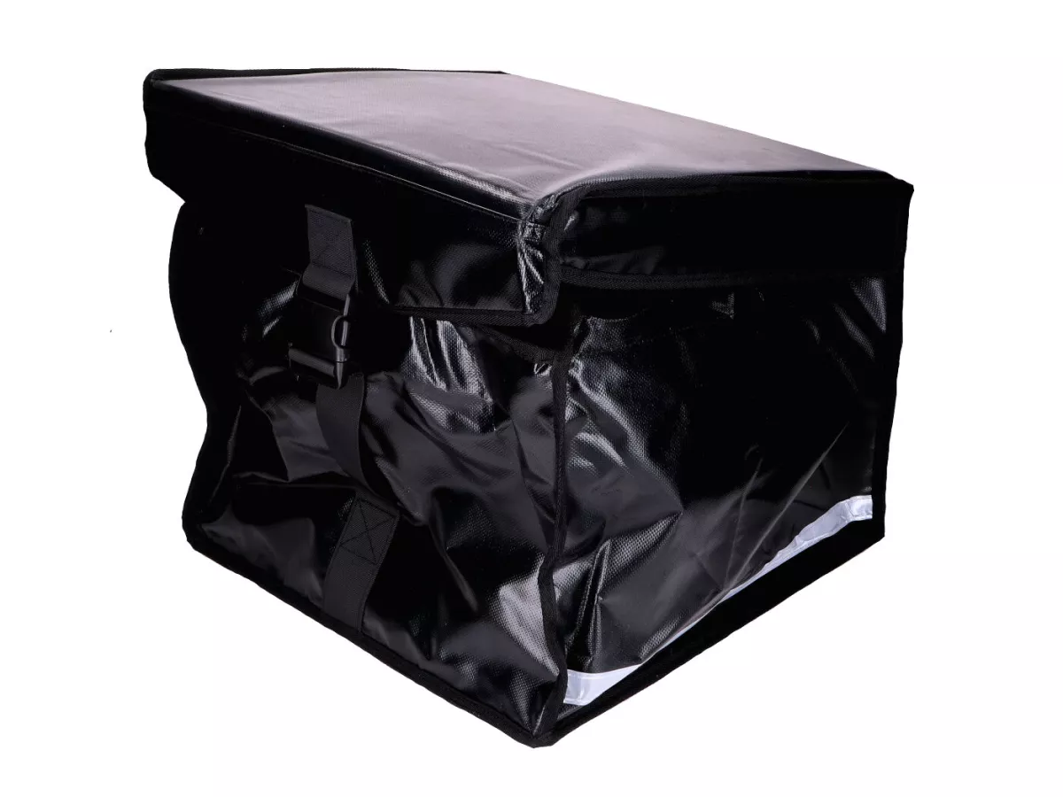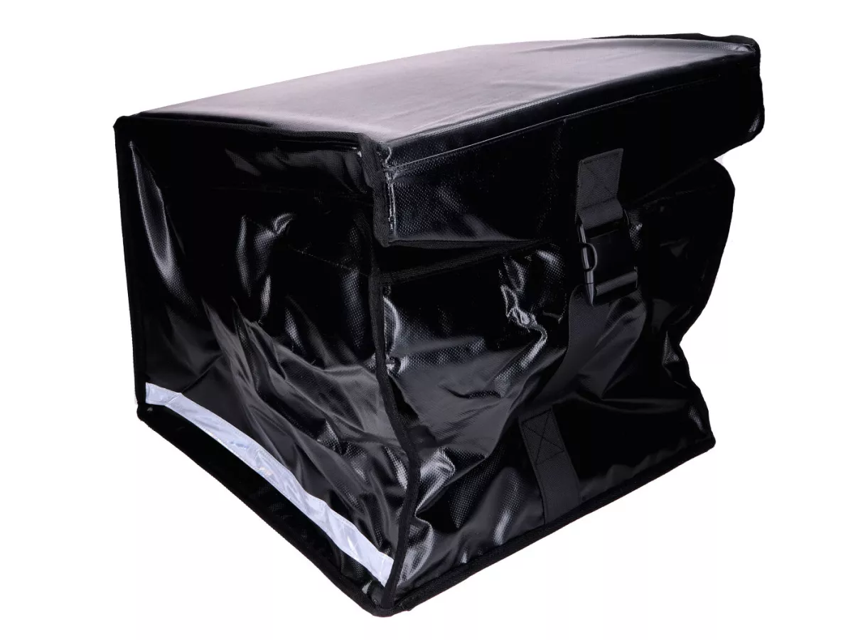 Schwarze Gepäckträgertasche im Lieferdienst-Format.