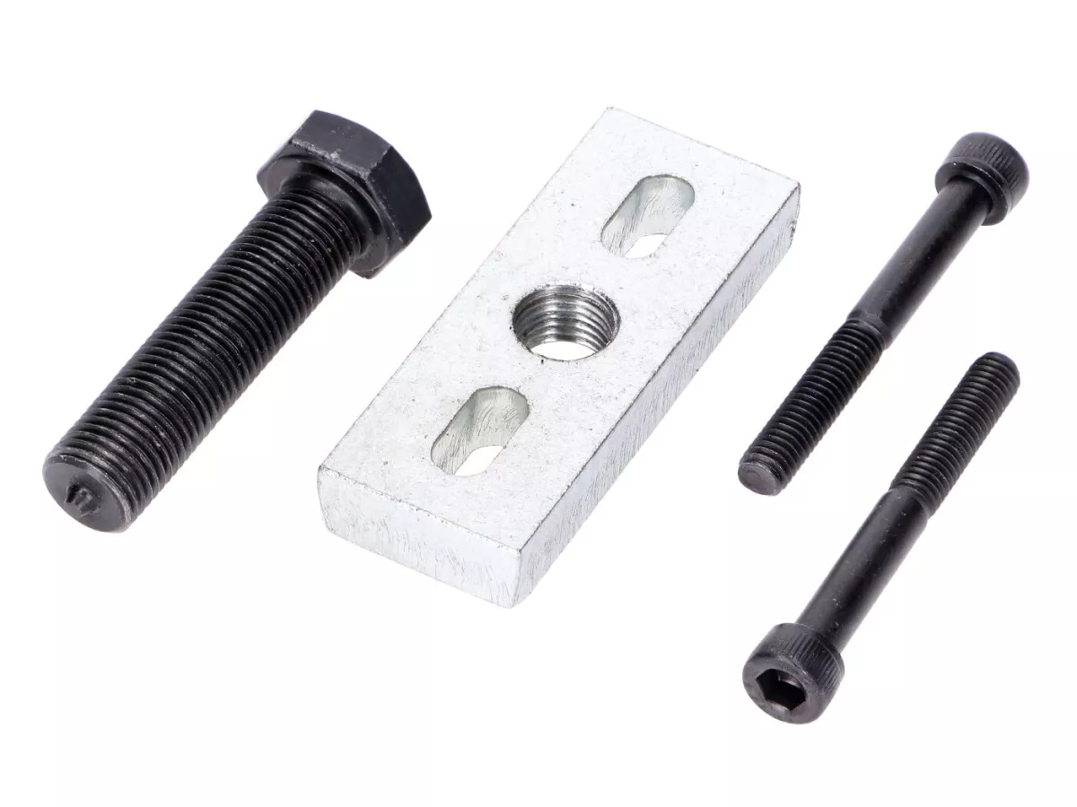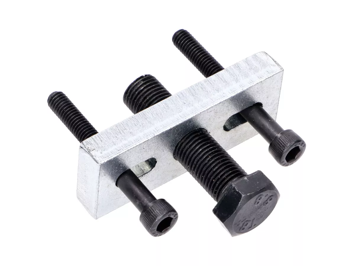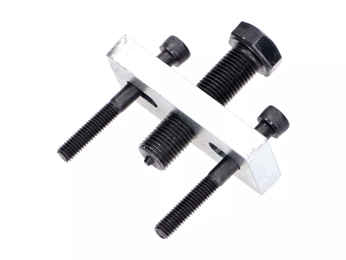 Abzieher für den Rotor der Lichtmaschine oder beim Mofa für die Kupplung passend für Aprilia mit Aprilia-Motor, Suzuki, Puch, Mobylette, Schaltmoped, so ziemlich allen Innenrotorzündungen und Minarelli mit liegendem Zylinder. Der Abzieher funktioniert durch das Einschrauben der beiden äußeren Innensechskant-Schrauben in die dafür vorgesehenen Gewindebohrungen des Rotors. Dann wird über die zentrale Schraube der Rotor abgedrückt. Die Langlöcher haben einen Abstand von 24 bis 52mm zueinander.