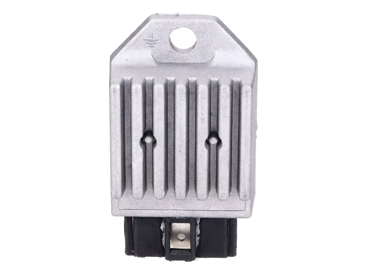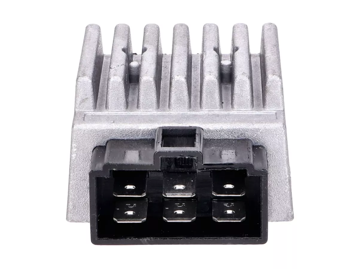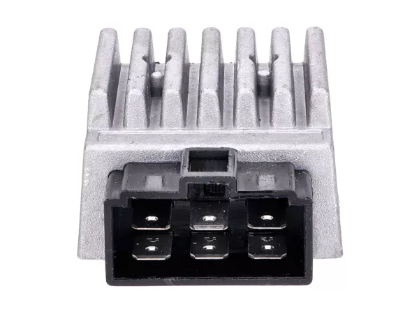 Laderegler mit integriertem Blinkerrelais. (6 Anschlüsse). Der Gleichrichter bzw. Regler ändert die in der Lichtmaschine erzeugte Wechselspannung in die im Bordnetz verwendete Gleichspannung von 12V und hält die Spannung in einem bestimmten Toleranzbereich. Damit wird die Batterie geladen und dafür gesorgt, dass beispielsweise Glühlampen nicht durchbrennen.