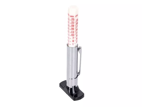 Der handliche Tiefenmesser zum akkuraten und schnellen Messen der Reifenprofiltiefe ist durch seine Metallkomponenten besonders stabil und haltbar. Das Reifenprofilmessgerät überzeugt außerdem im Alltag durch sein praktisches kleines Format und die nützliche Halteklammer.