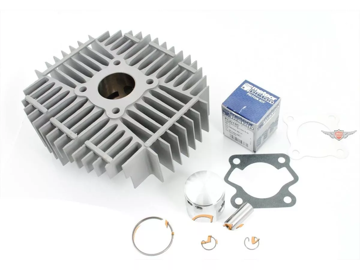 Angeboten wird ein neuer Supertherm Aluminium 60ccm Zylinder Satz mit Nickasil beschichtung und zusätzlichen Überstrom Kanälen, Meteor Kolben mit Fenster, für maximale Leistung und Drehzahl von Voskamp in Holland überarbeitet, Top Qualität in sehr guter Verarbeitung passend bei Kreidler Florett RS und anderen mit großem Stehbolzen Abstand.