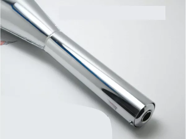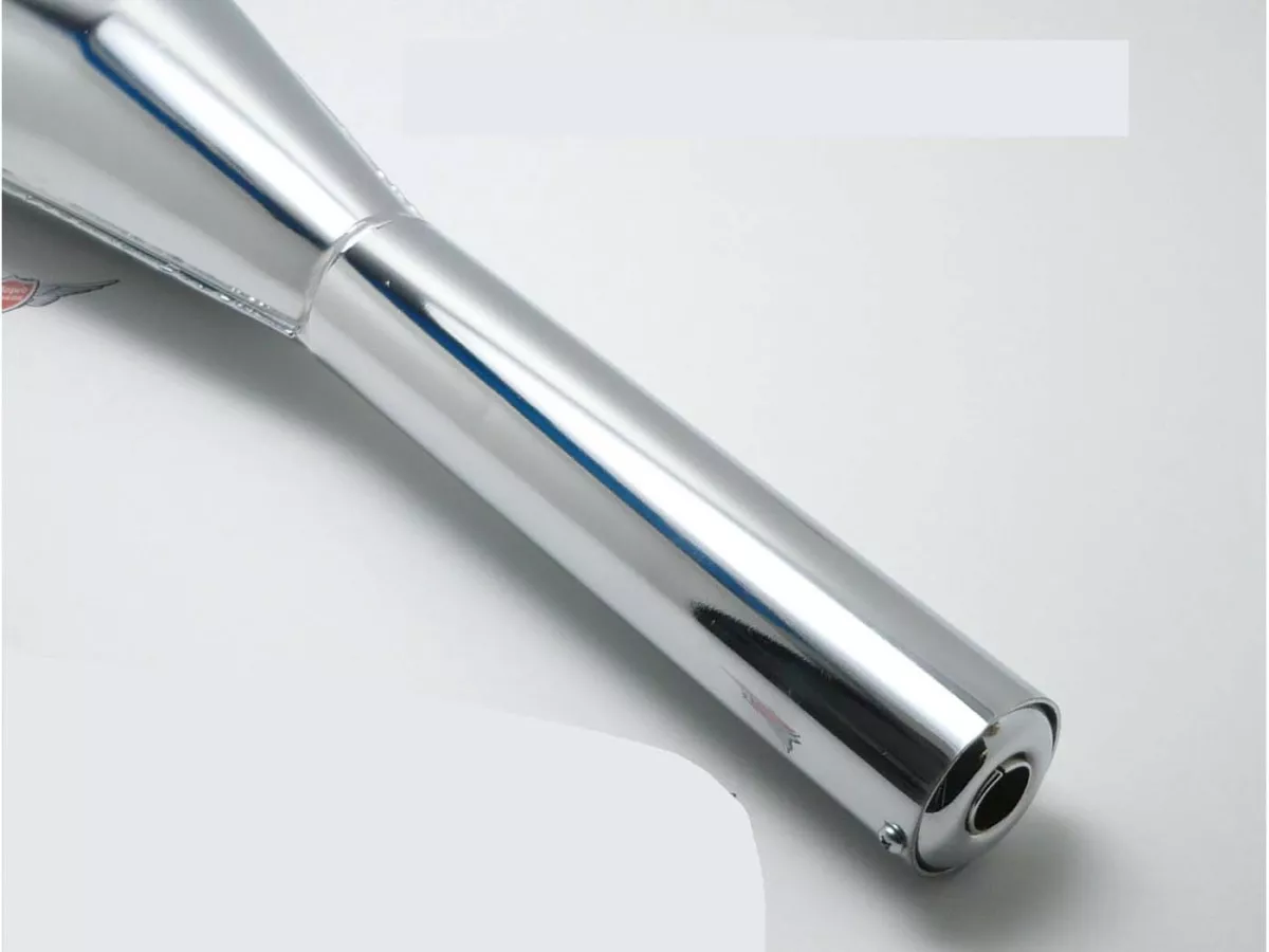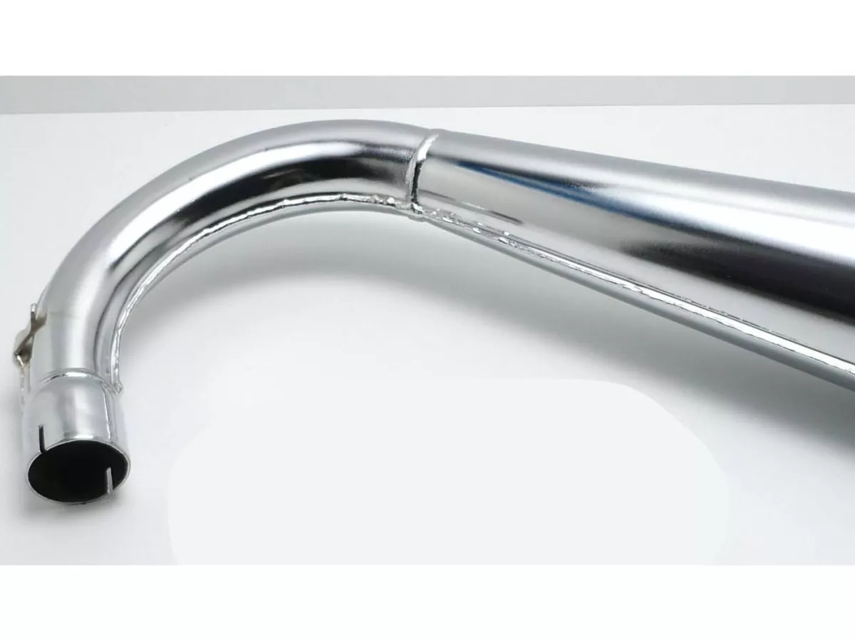 Chrom Rennauspuff Race mit 36mm Steckanschluss, passend für Zündapp CS C 50 Sport GTS KS 50 und viele andere Modelle. Steckanschluss: ca. 36mm, Länge: ca. 820mm, Schalldämpferdurchmesser: ca. 51mm, Durchmesser der Birne: ca. 90mm.