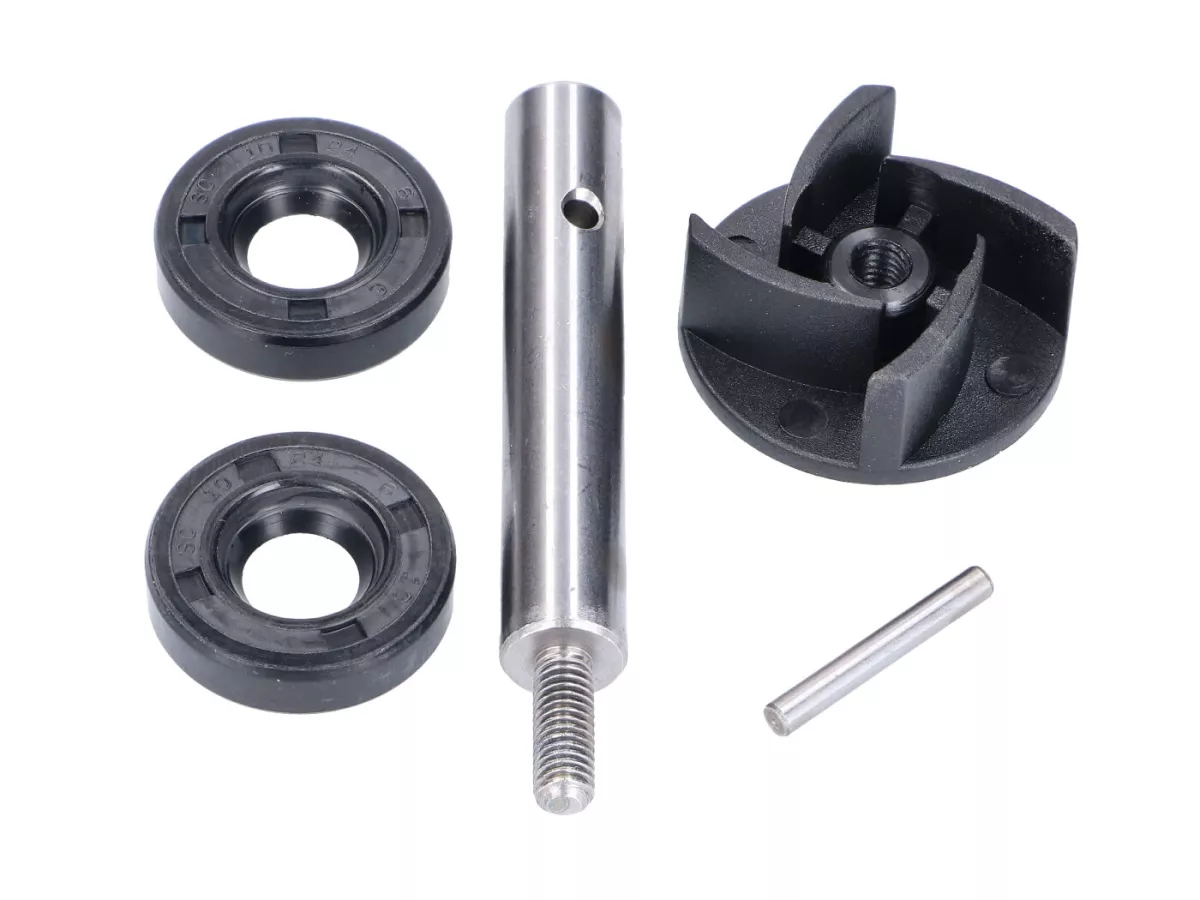Reparaturkit für die Wasserpumpe passend für Derbi EBE / EBS Motoren. Im Kit sind alle abgebildeten Teile enthalten.