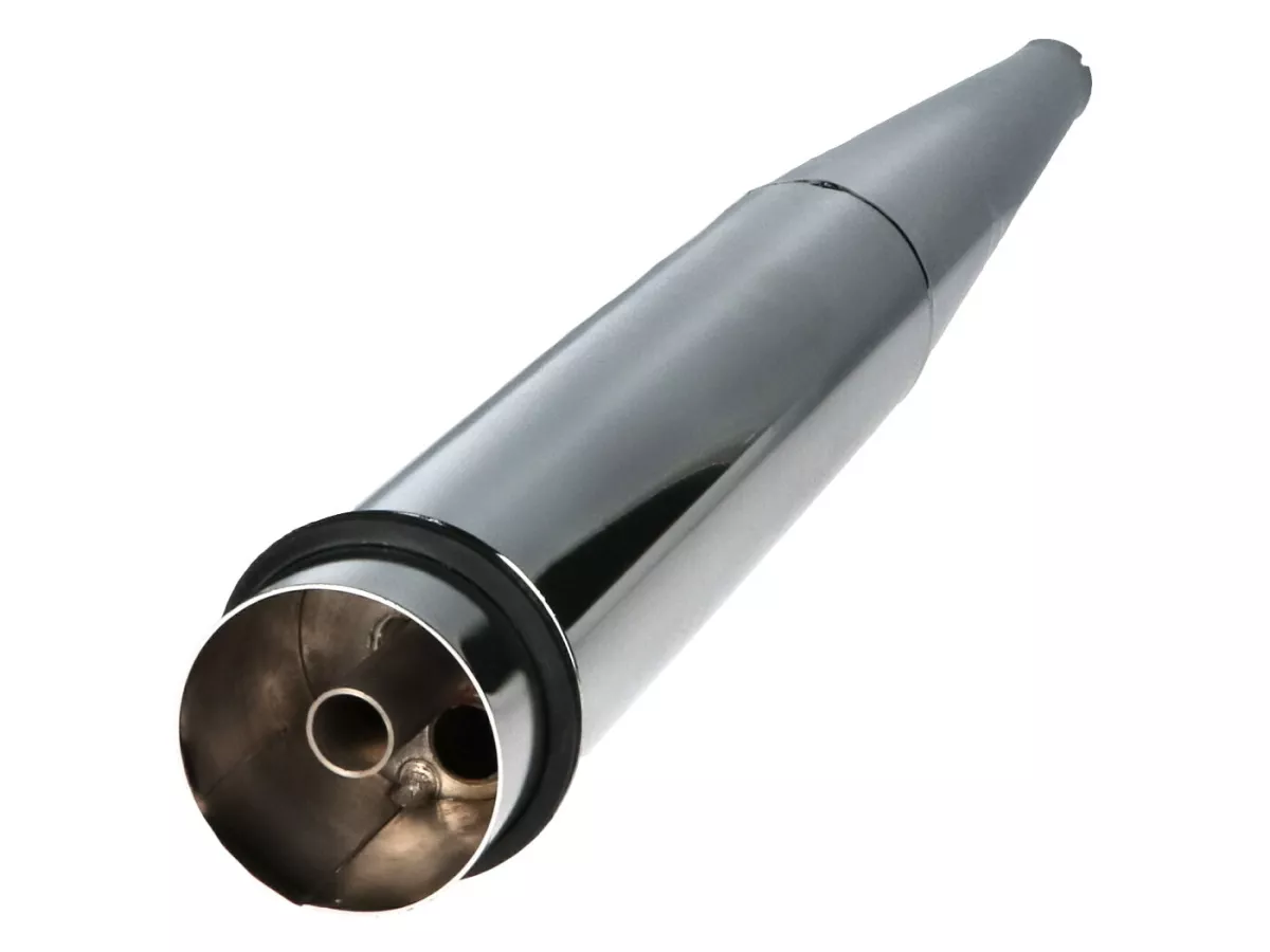 Chrom-Finish Resonanz-Auspuff in neutraler Optik mit 28mm Krümmer-Anschlussflansch. Endstück / Tüte und Schalldämpfer sowie Endstück-Schelle gehören zum Lieferumfang.