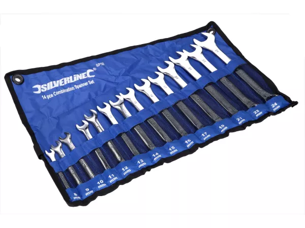 14-teiliger Satz Ring-Maulschlüssel mit robuster Aufbewahrungstasche aus Nylon. Die Maulschlüssel bestehen aus vergütetem, gesenkgeschmiedetem Chrom-Vanadium-Stahl mit polierter Oberfläche und sind um 15° gekröpft, um einen besseren Zugriff zu ermöglichen.