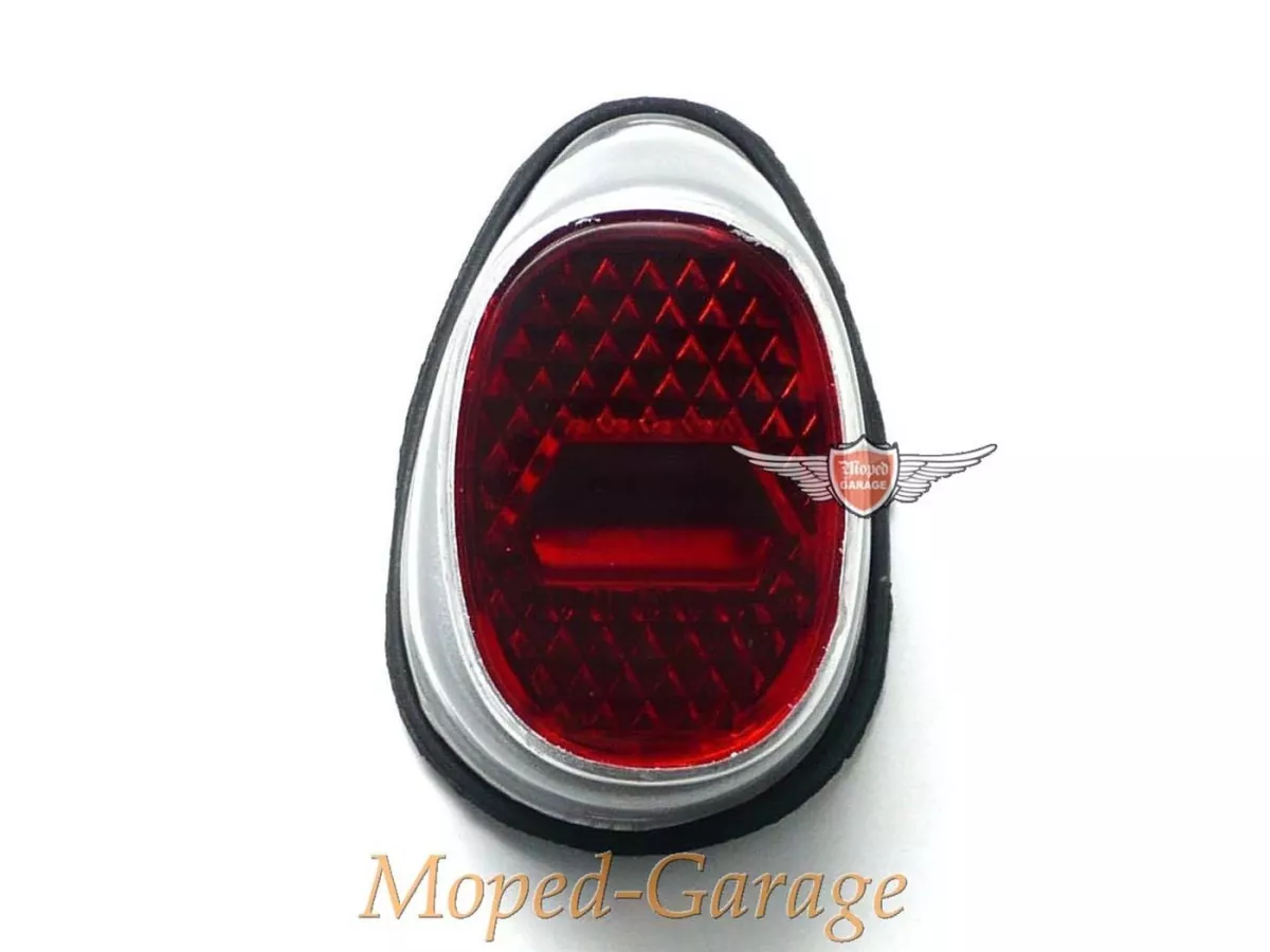 Rücklicht unter anderem passend für Miele DKW NSU Göricke Gritzner Zündapp Kreidler Hercules Puch Mofa Moped Mokick KKR und andere. Ohne Leuchtmittel mit Gummiunterlage. Gehäuse Metall Silber lackiert. Breit ca. 56mm, hoch ca. 95mm, tief ca. 50mm.