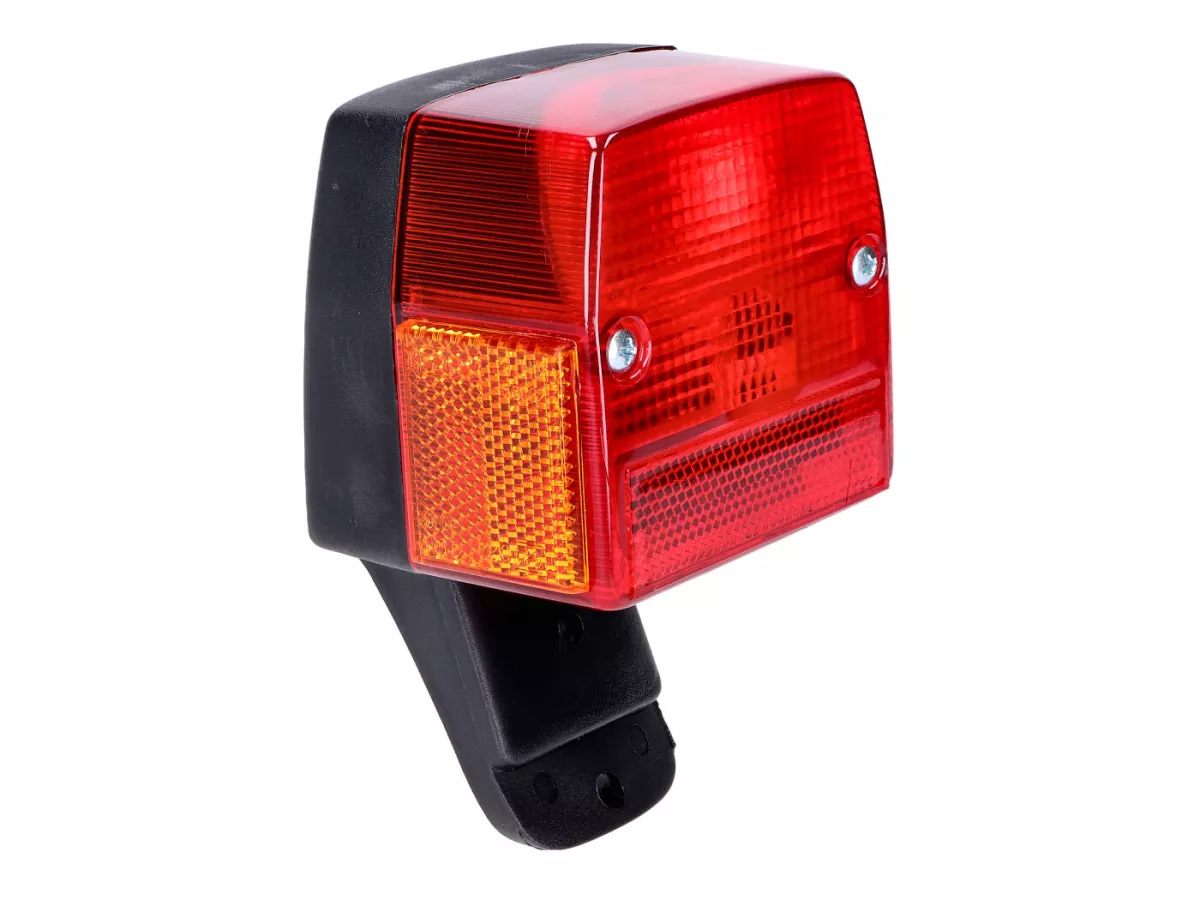 Universales Rücklicht mit Lampenträger und Streuglas in einer kompakten Baugröße mit seitlich angebrachten Seitenstrahlern in Gelb passend für viele Puch, Kreidler, Zündapp, Sachs Mopeds und Mopeds diverser anderer Hersteller.