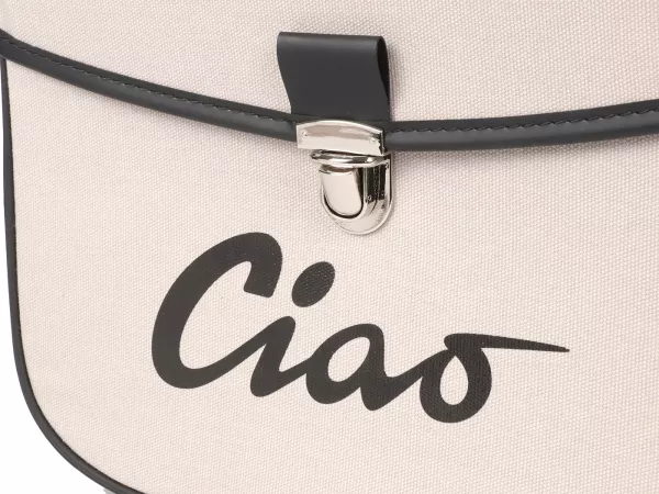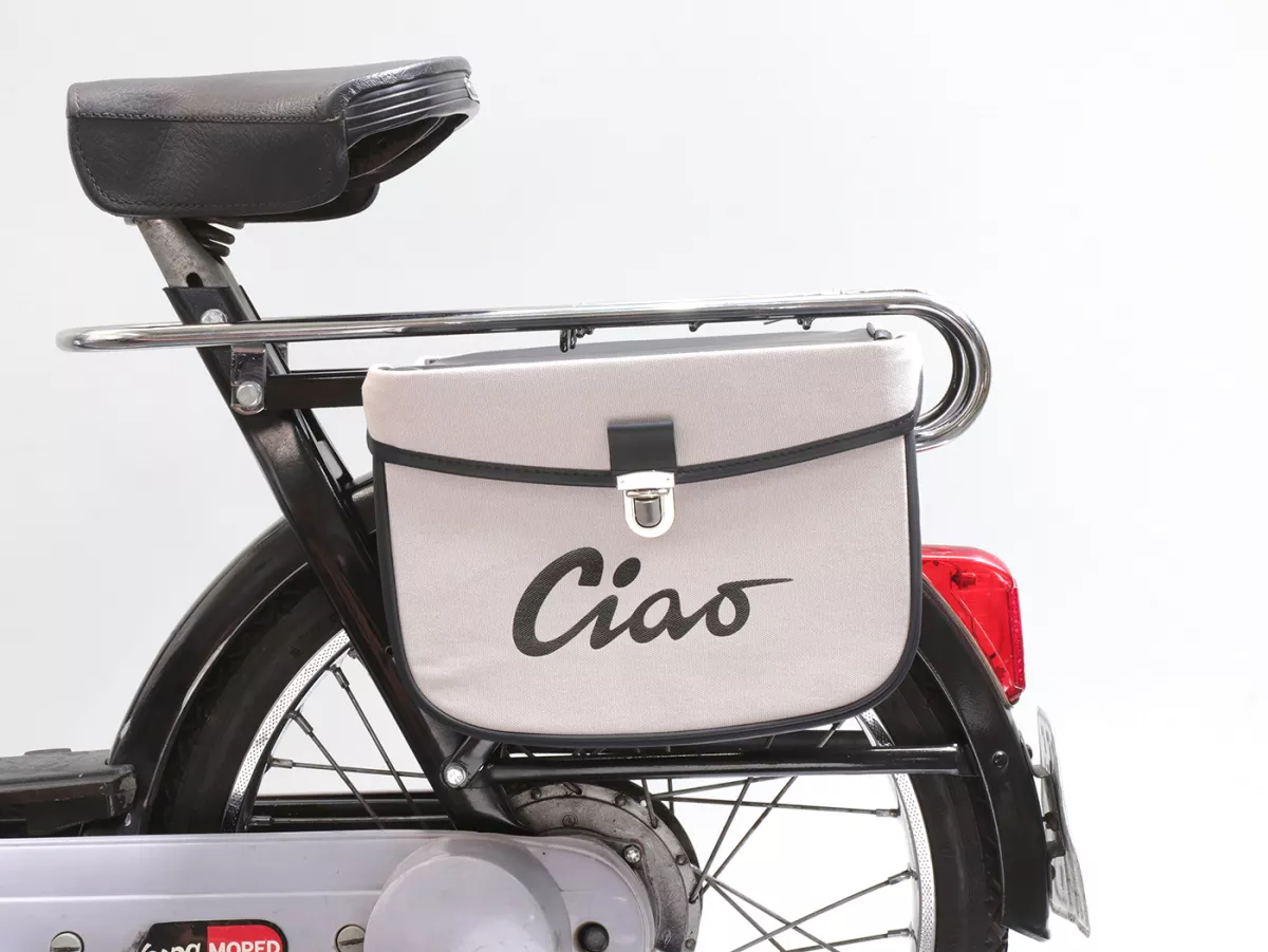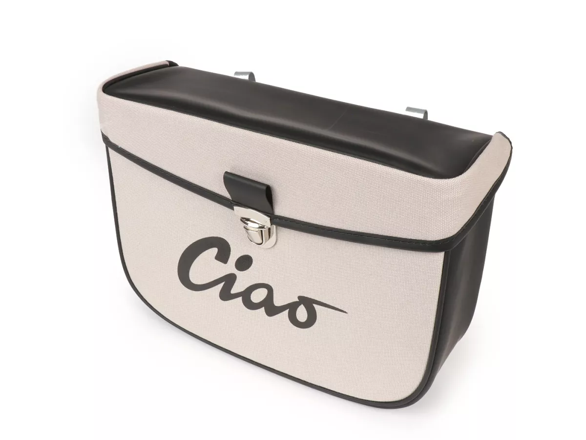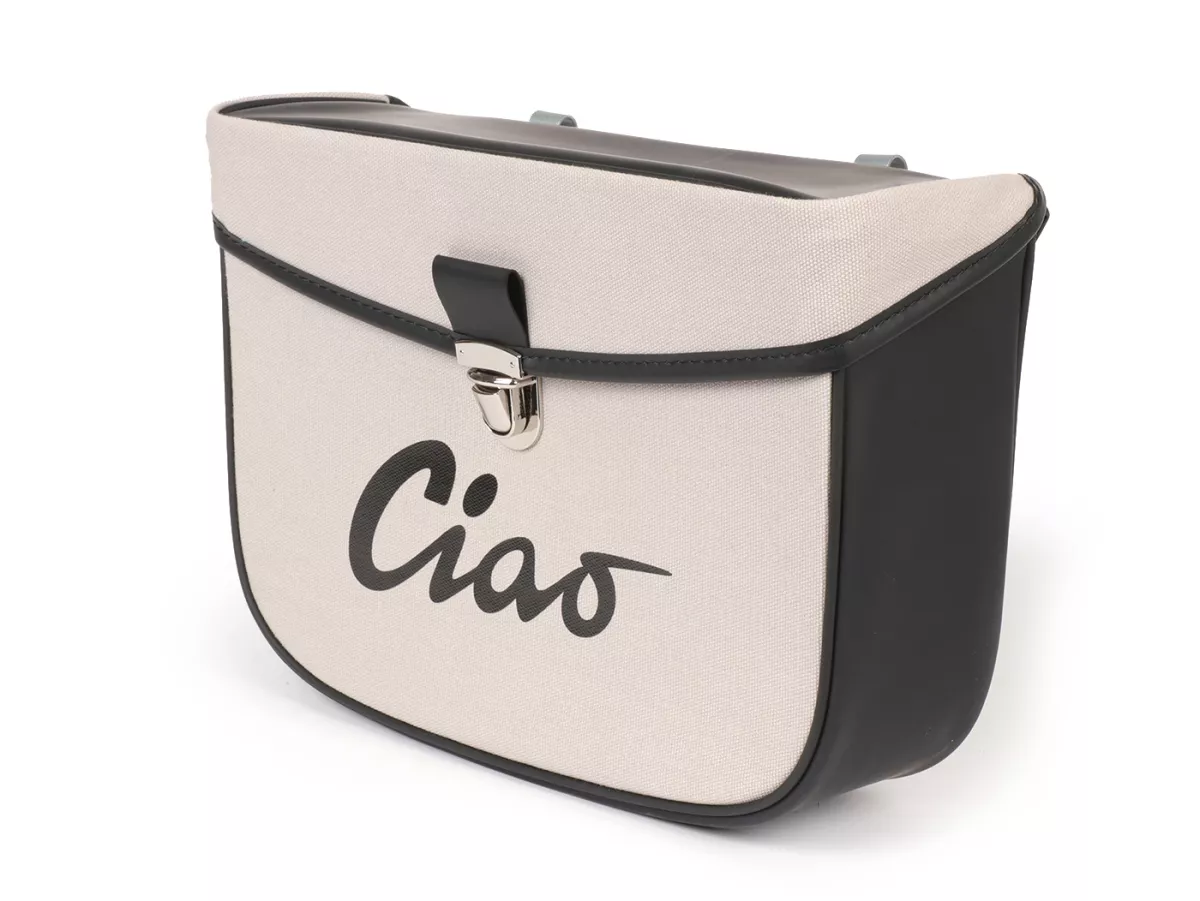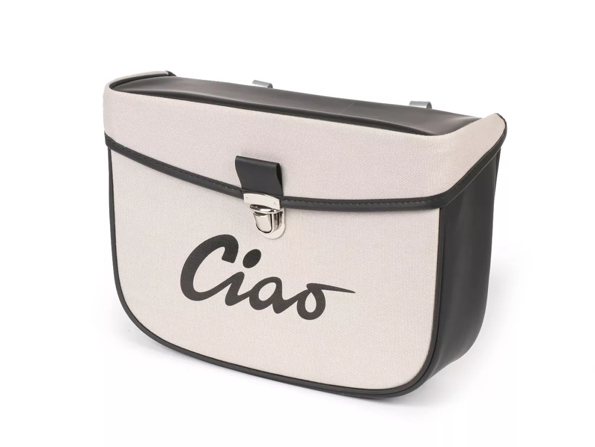 Wunderschöne Satteltasche von Moto Nostra, die mittels zweier Haken und eine Feder ganz einfach seitlich an der Gepäckbrücke Eurer Ciao befestigt wird. Sie bietet ordentlich Stauraum und bleibt, dank Verstärkung, immer in Form. Deckel und Seiten sind aus wasserdichtem PVC, die Front besteht aus Canvas mit bedrucktem Ciao-Schriftzug. Wichtige Utensilien wie Portemonnaie, Sonnenbrille, Schlüssel, Papiere, Werkzeug und Öl finden hier endlich ausreichend Platz.