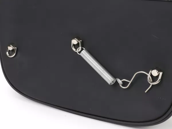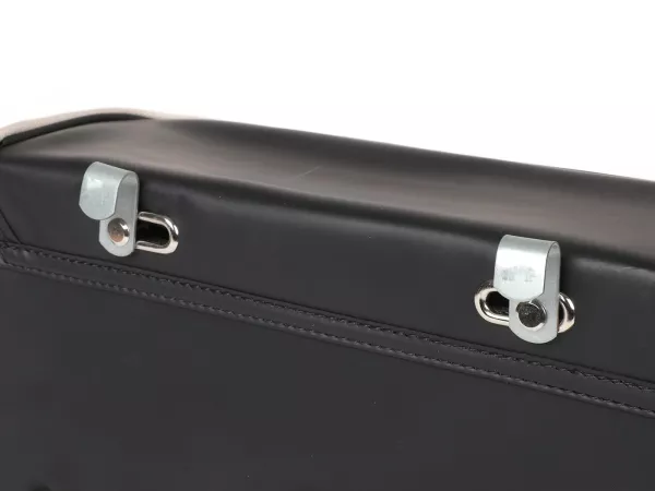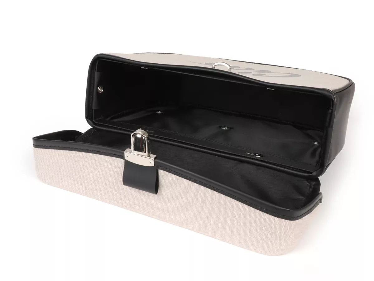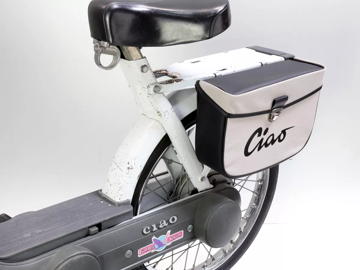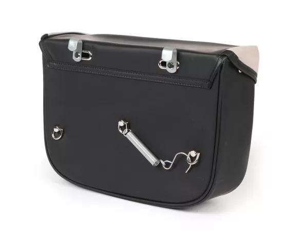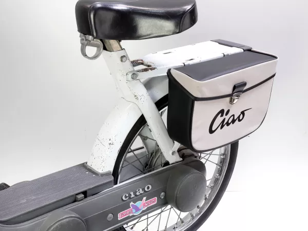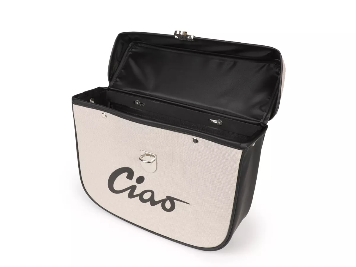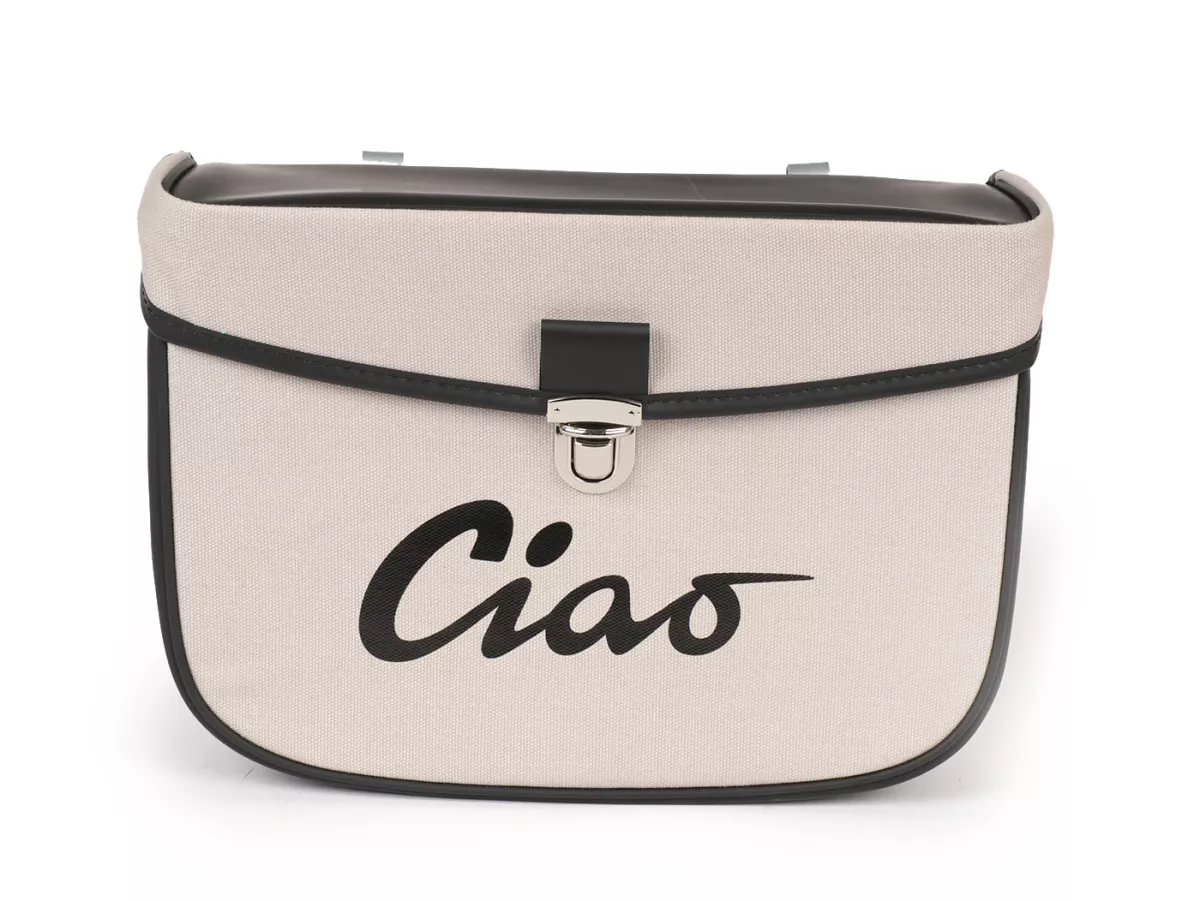 Wunderschöne Satteltasche von Moto Nostra, die mittels zweier Haken und eine Feder ganz einfach seitlich an der Gepäckbrücke Eurer Ciao befestigt wird. Sie bietet ordentlich Stauraum und bleibt, dank Verstärkung, immer in Form. Deckel und Seiten sind aus wasserdichtem PVC, die Front besteht aus Canvas mit bedrucktem Ciao-Schriftzug. Wichtige Utensilien wie Portemonnaie, Sonnenbrille, Schlüssel, Papiere, Werkzeug und Öl finden hier endlich ausreichend Platz.