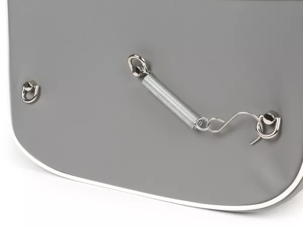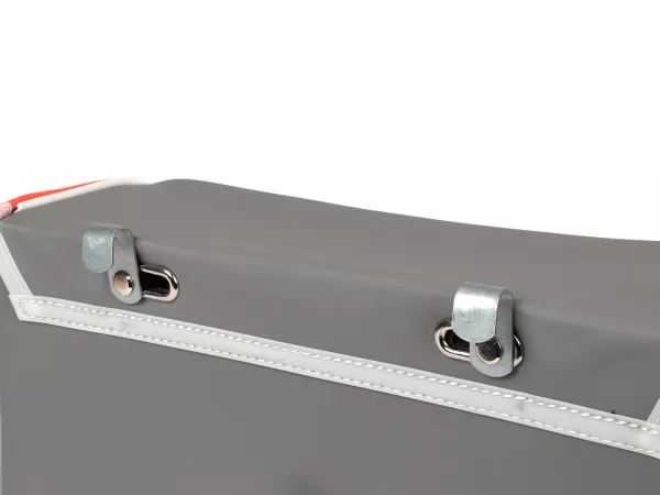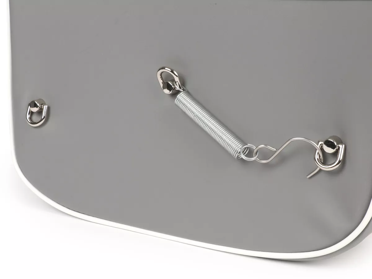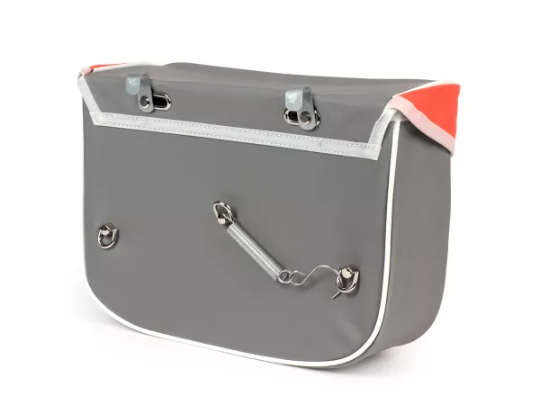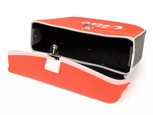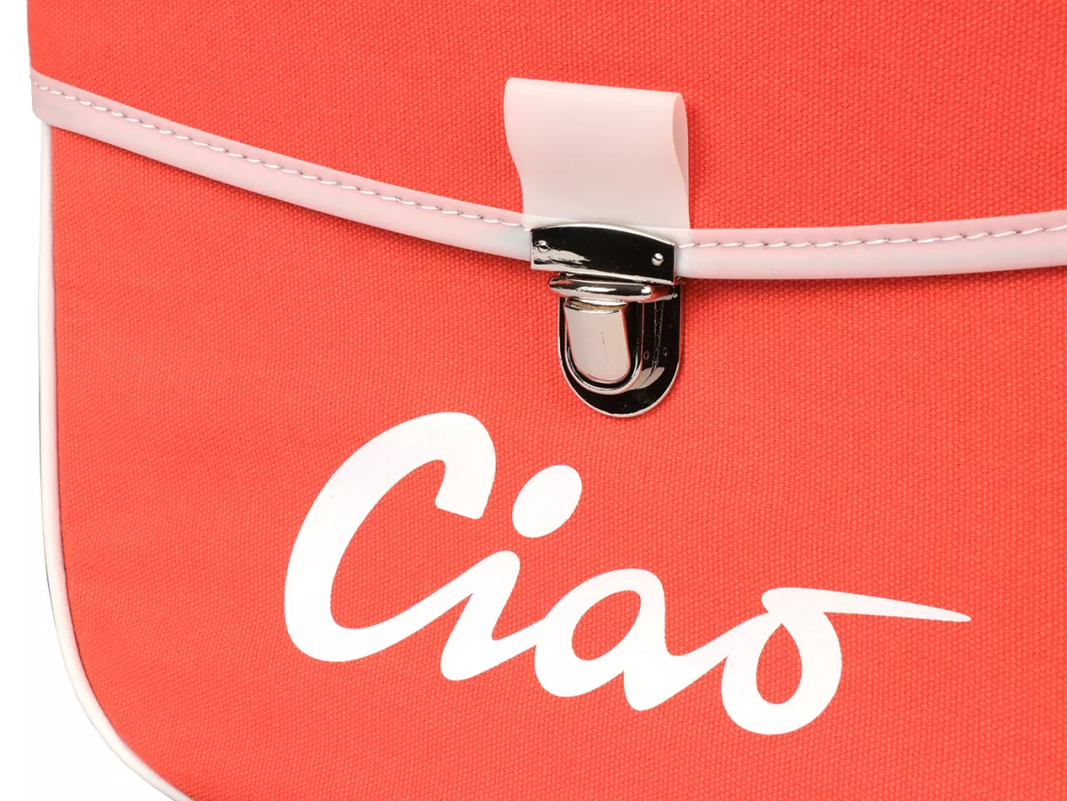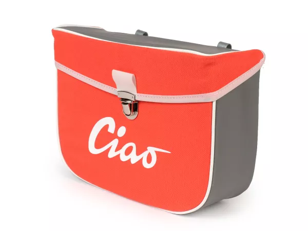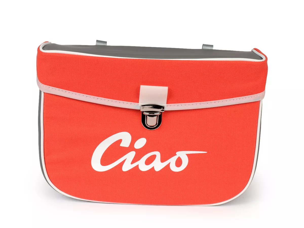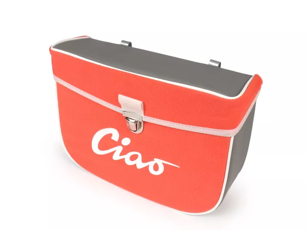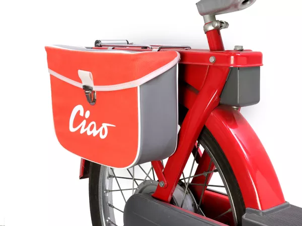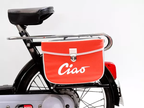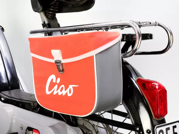 Wunderschöne Satteltasche von Moto Nostra, die mittels zweier Haken und eine Feder ganz einfach seitlich an der Gepäckbrücke Eurer Ciao befestigt wird. Sie bietet ordentlich Stauraum und bleibt, dank Verstärkung, immer in Form. Deckel und Seiten sind aus wasserdichtem PVC, die Front besteht aus Canvas mit bedrucktem Ciao-Schriftzug. Wichtige Utensilien wie Portemonnaie, Sonnenbrille, Schlüssel, Papiere, Werkzeug und Öl finden hier endlich ausreichend Platz.