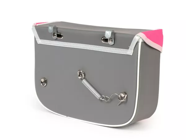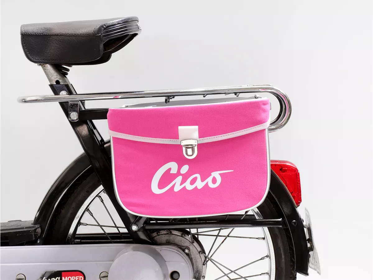 Wunderschöne Satteltasche von Moto Nostra, die mittels zweier Haken und eine Feder ganz einfach seitlich an der Gepäckbrücke Eurer Ciao befestigt wird. Sie bietet ordentlich Stauraum und bleibt, dank Verstärkung, immer in Form. Deckel und Seiten sind aus wasserdichtem PVC, die Front besteht aus Canvas mit bedrucktem Ciao-Schriftzug. Wichtige Utensilien wie Portemonnaie, Sonnenbrille, Schlüssel, Papiere, Werkzeug und Öl finden hier endlich ausreichend Platz.