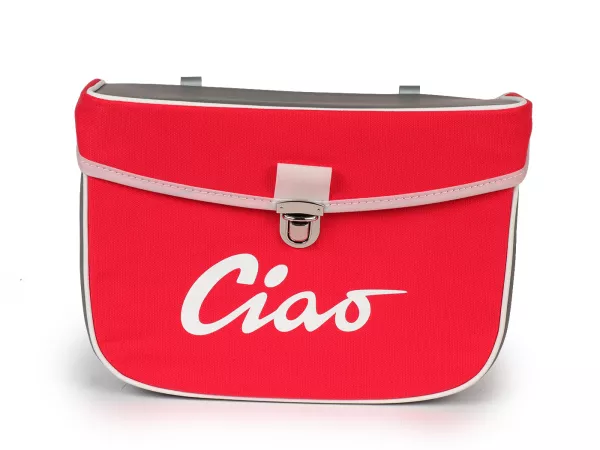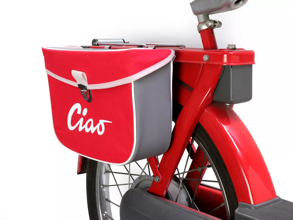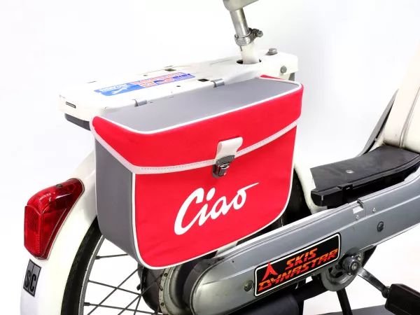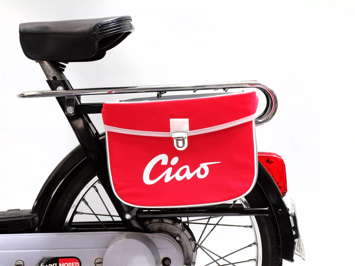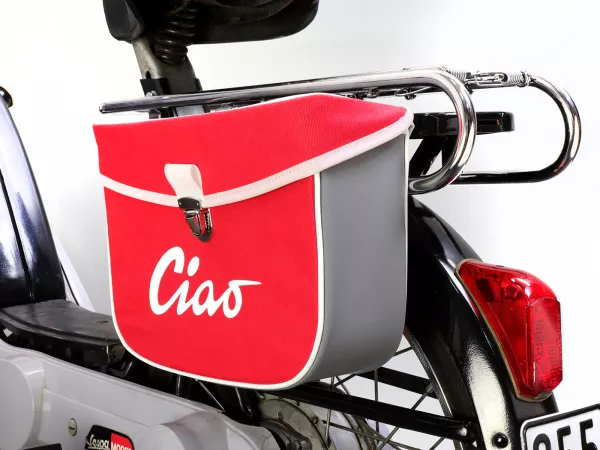 Wunderschöne Satteltasche von Moto Nostra, die mittels zweier Haken und eine Feder ganz einfach seitlich an der Gepäckbrücke Eurer Ciao befestigt wird. Sie bietet ordentlich Stauraum und bleibt, dank Verstärkung, immer in Form. Deckel und Seiten sind aus wasserdichtem PVC, die Front besteht aus Canvas mit bedrucktem Ciao-Schriftzug. Wichtige Utensilien wie Portemonnaie, Sonnenbrille, Schlüssel, Papiere, Werkzeug und Öl finden hier endlich ausreichend Platz.