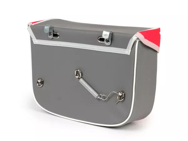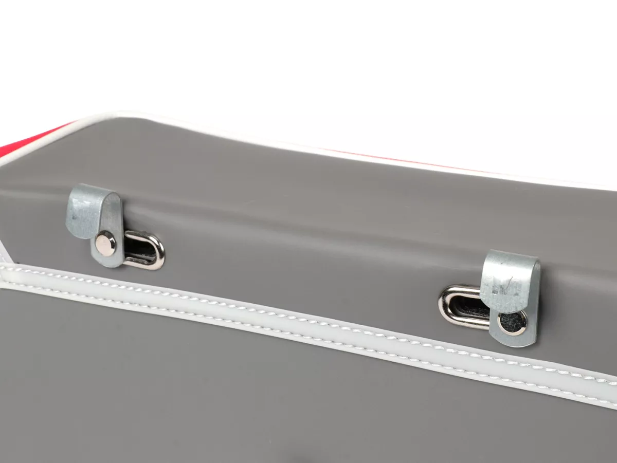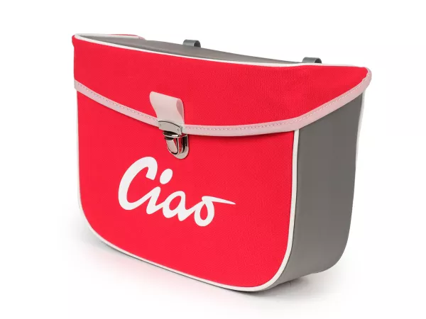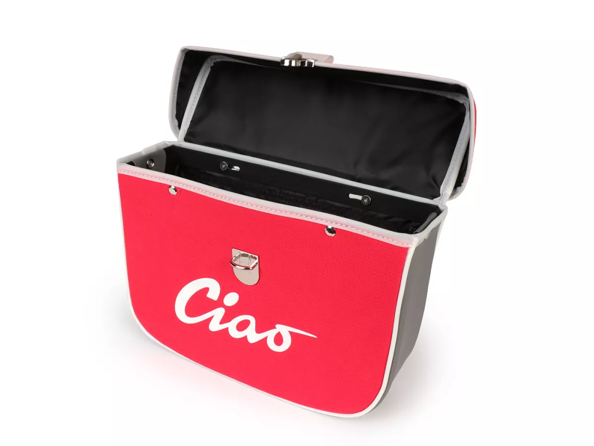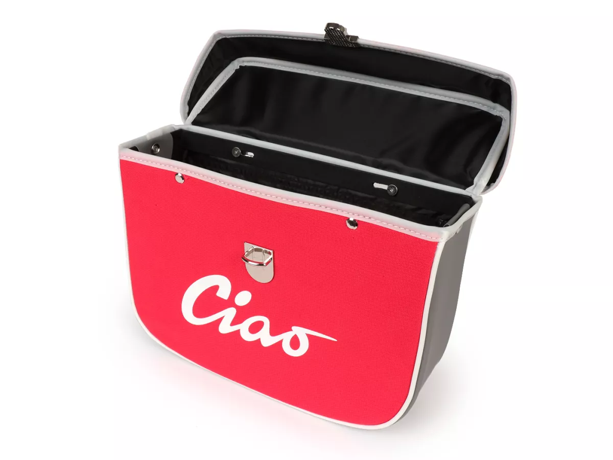 Wunderschöne Satteltasche von Moto Nostra, die mittels zweier Haken und eine Feder ganz einfach seitlich an der Gepäckbrücke Eurer Ciao befestigt wird. Sie bietet ordentlich Stauraum und bleibt, dank Verstärkung, immer in Form. Deckel und Seiten sind aus wasserdichtem PVC, die Front besteht aus Canvas mit bedrucktem Ciao-Schriftzug. Wichtige Utensilien wie Portemonnaie, Sonnenbrille, Schlüssel, Papiere, Werkzeug und Öl finden hier endlich ausreichend Platz.