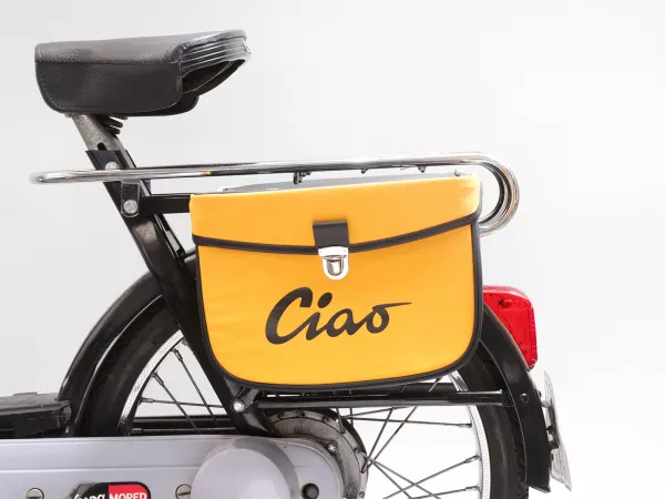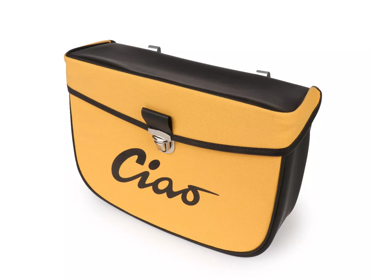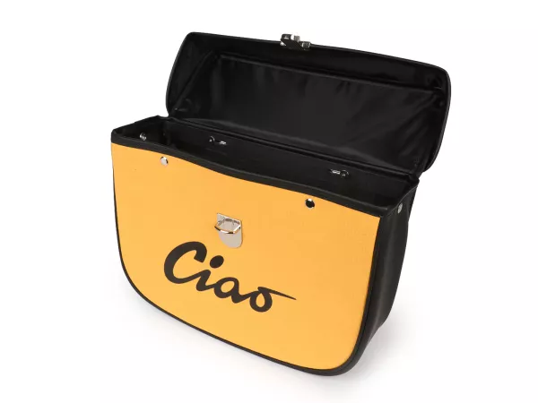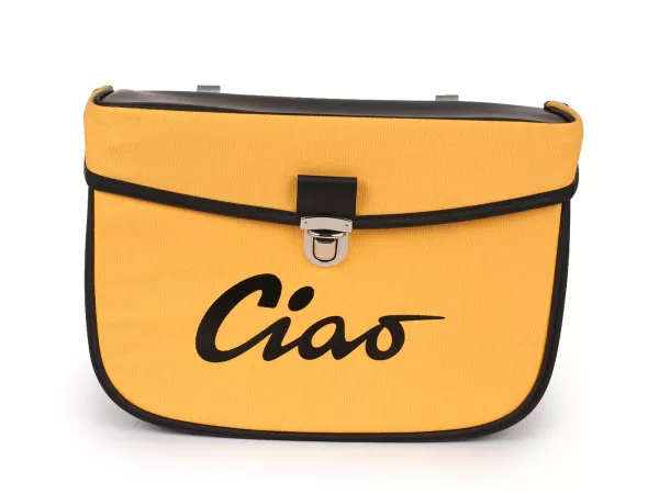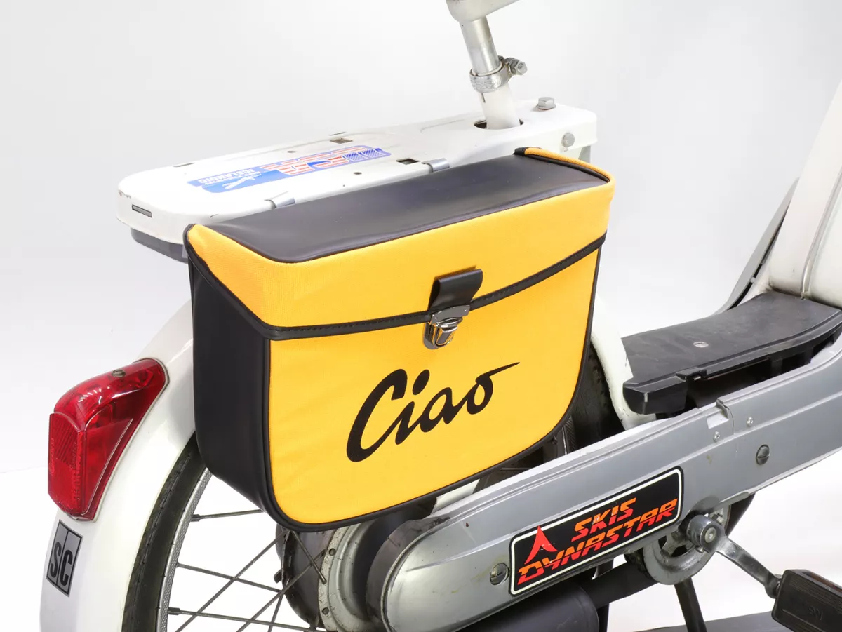 Wunderschöne Satteltasche von Moto Nostra, die mittels zweier Haken und eine Feder ganz einfach seitlich an der Gepäckbrücke Eurer Ciao befestigt wird. Sie bietet ordentlich Stauraum und bleibt, dank Verstärkung, immer in Form. Deckel und Seiten sind aus wasserdichtem PVC, die Front besteht aus Canvas mit bedrucktem Ciao-Schriftzug. Wichtige Utensilien wie Portemonnaie, Sonnenbrille, Schlüssel, Papiere, Werkzeug und Öl finden hier endlich ausreichend Platz.