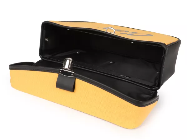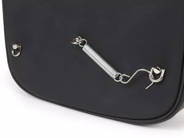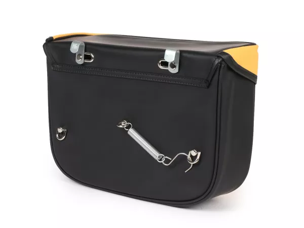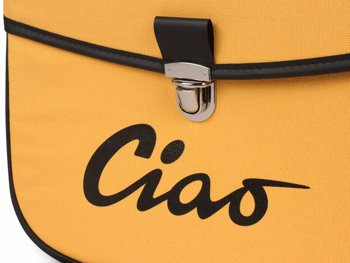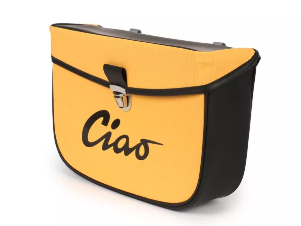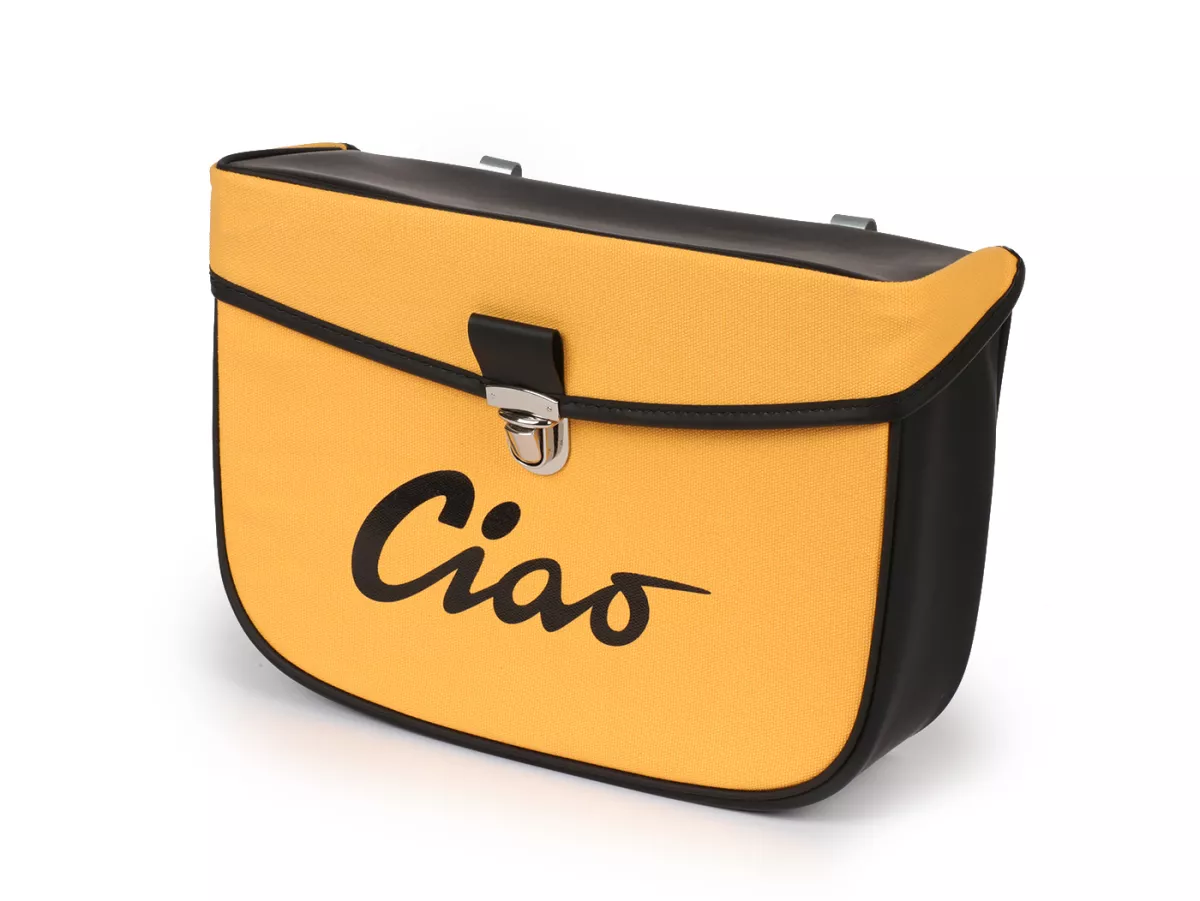 Wunderschöne Satteltasche von Moto Nostra, die mittels zweier Haken und eine Feder ganz einfach seitlich an der Gepäckbrücke Eurer Ciao befestigt wird. Sie bietet ordentlich Stauraum und bleibt, dank Verstärkung, immer in Form. Deckel und Seiten sind aus wasserdichtem PVC, die Front besteht aus Canvas mit bedrucktem Ciao-Schriftzug. Wichtige Utensilien wie Portemonnaie, Sonnenbrille, Schlüssel, Papiere, Werkzeug und Öl finden hier endlich ausreichend Platz.