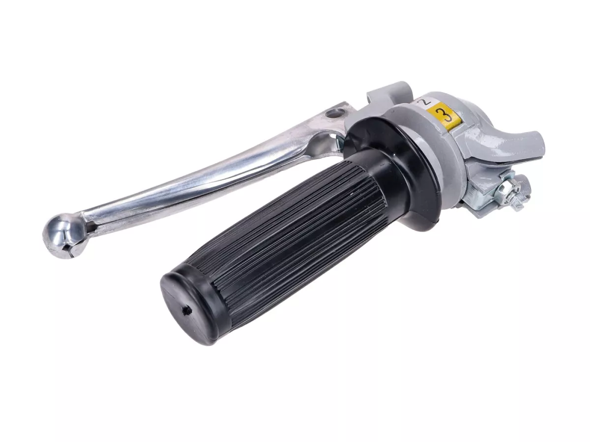 3-Gang-Schaltgriff mit Rillengummi und Aluminiumhebel, komplett einbaufertig, passend für Kreidler Flory mit 3-Gang-Handschaltung. Armatur in Grau, Griffgummi in Schwarz.