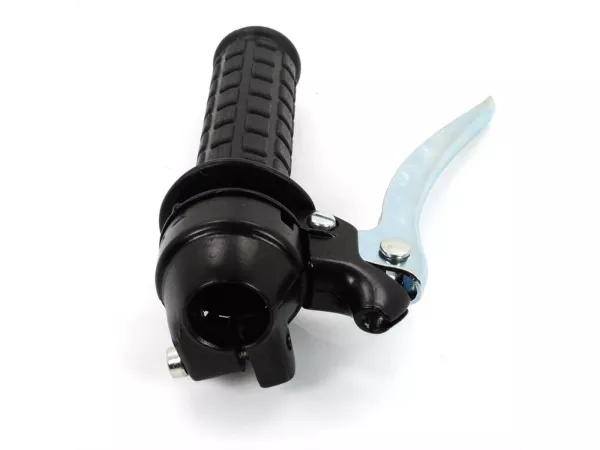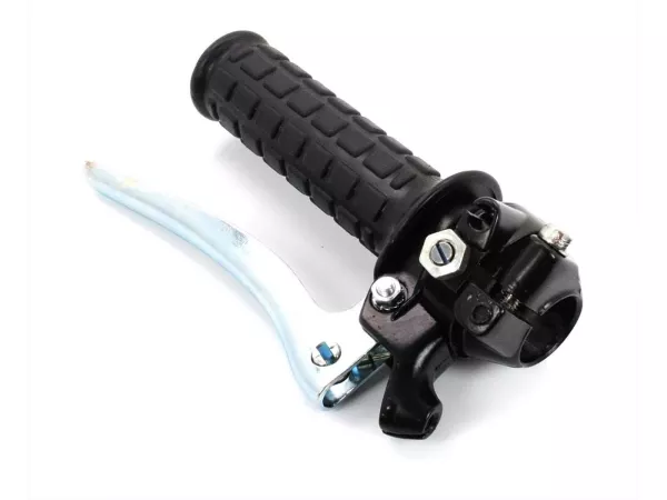 2-Gang-Schaltgriff in Schwarz mit Chrom-Kupplungshebel, ohne Stellschraubengewinde. Beim Einbau muss die Stellschraube am Schaltzug entfernt und mit einem Schraubnippel oder Lötnippel montiert werden. Zugeinstellung erfolgt über die Stellschraube am Ansaugstutzen. Kostengünstige Nachbaualternative.
