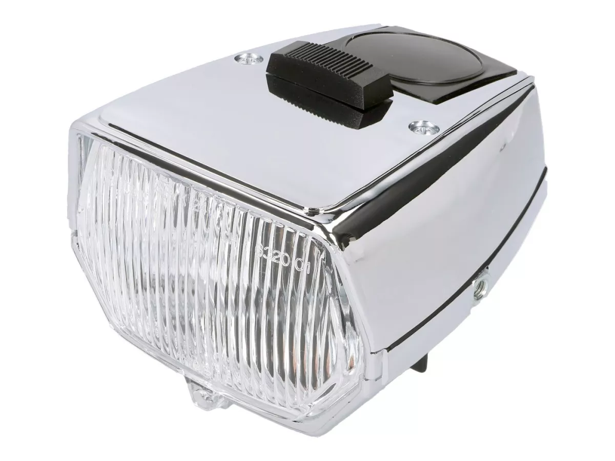 Verchromter Ersatz-Scheinwerfer inklusive Schalter und herausnehmbarer Tachoblende zum Beispiel für Puch Maxi N Mofas.