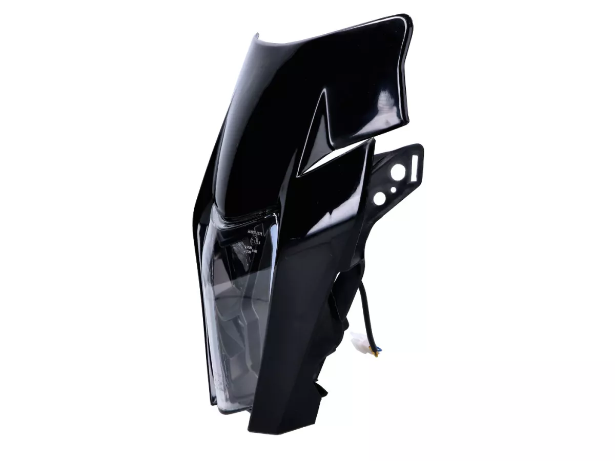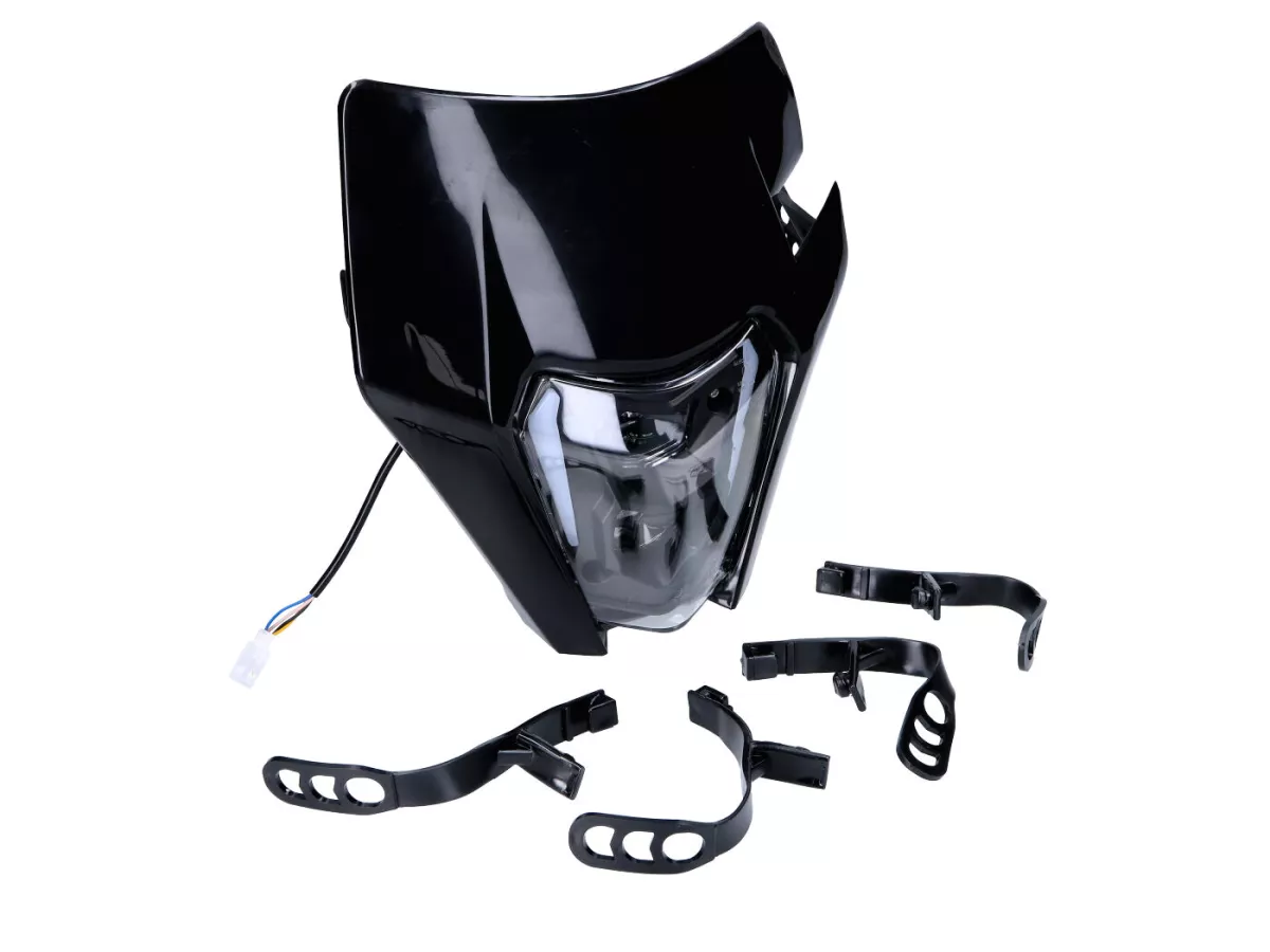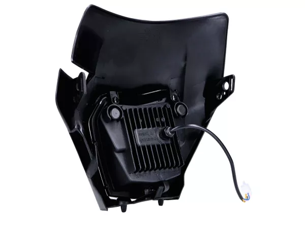 LED Scheinwerfer mit schwarzer Maske für Enduro Mopeds. Passend für KTM EXC bis Baujahr 2020. Anschluss über 4-Pin Stecker. Inklusive Leuchtmittel.