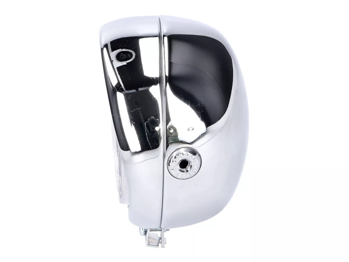Runder Scheinwerfer mit verchromtem Gehäuse und Chromring als Ersatzteil unter anderem passend für Puch Maxi, Zündapp, Kreidler Mofa. Eine Glühlampe wird nicht mitgeliefert und muss separat bestellt werden. Scheinwerferglas mit Guia-Logo.