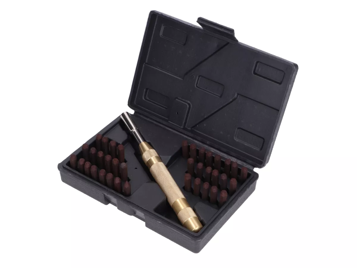 Das 36-teilige Stempel-Set besteht kommt mit allen Buchstaben und Zahlen, sowie einer Körnerspitze zum leichten Anbringen von Markierungen. Die Schlagbuchstaben und Schlagzahlen haben einen Durchmesser von 4mm. Mit dem Schlagstempel lassen sich Aluminium, Blech, Holz, Leder, Kupfer und Faserverbundwerkstoffe markieren.