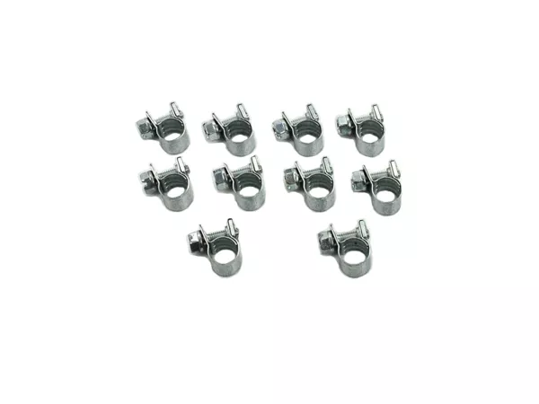 Packung mit 10 Benzinschlauch Schraubschellen für Schläuche mit einem Außendurchmesser von 8 bis 10mm. Geeignet für Mofas, Mopeds, Mokicks, Roller und KKR von Marken wie Zündapp, Kreidler, Hercules, Puch und Simson.
