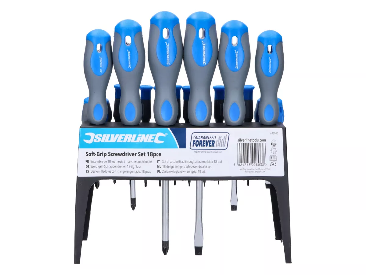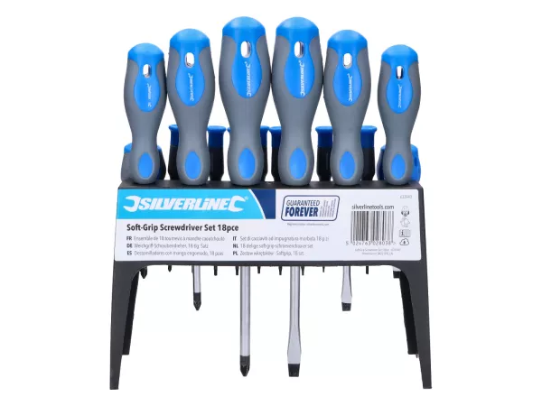 18-teiliger Satz Schraubendreher inkl. Ständer. Schraubendreher mit Weichgriff. Dieser Satz beinhaltet 8 Standard-Schraubendreher in den Größen