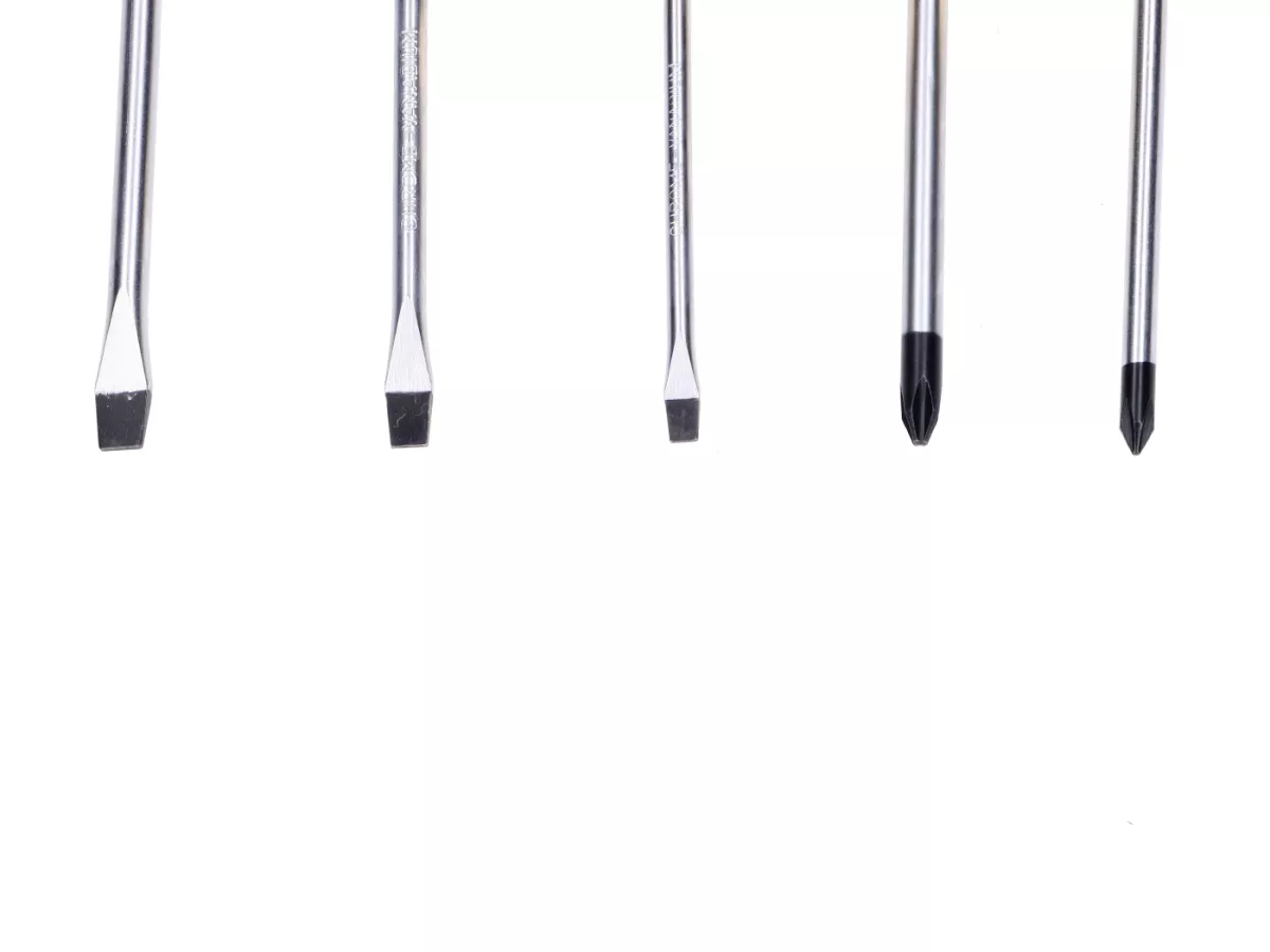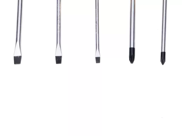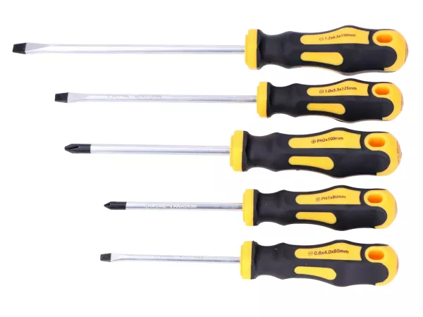 5-teiliger Satz Universal-Schraubendreher aus Chrom-Vanadium-Stahl mit schwarzen, magnetische Spitzen und 2-Komponenten-Griffen aus Kunststoff (schwarz / gelb). Die Schraubendreher sind beschriftet und verfügen über eine Öse zu Aufhängen.