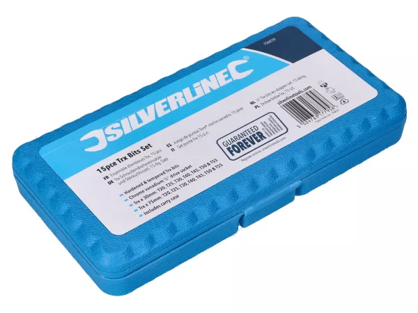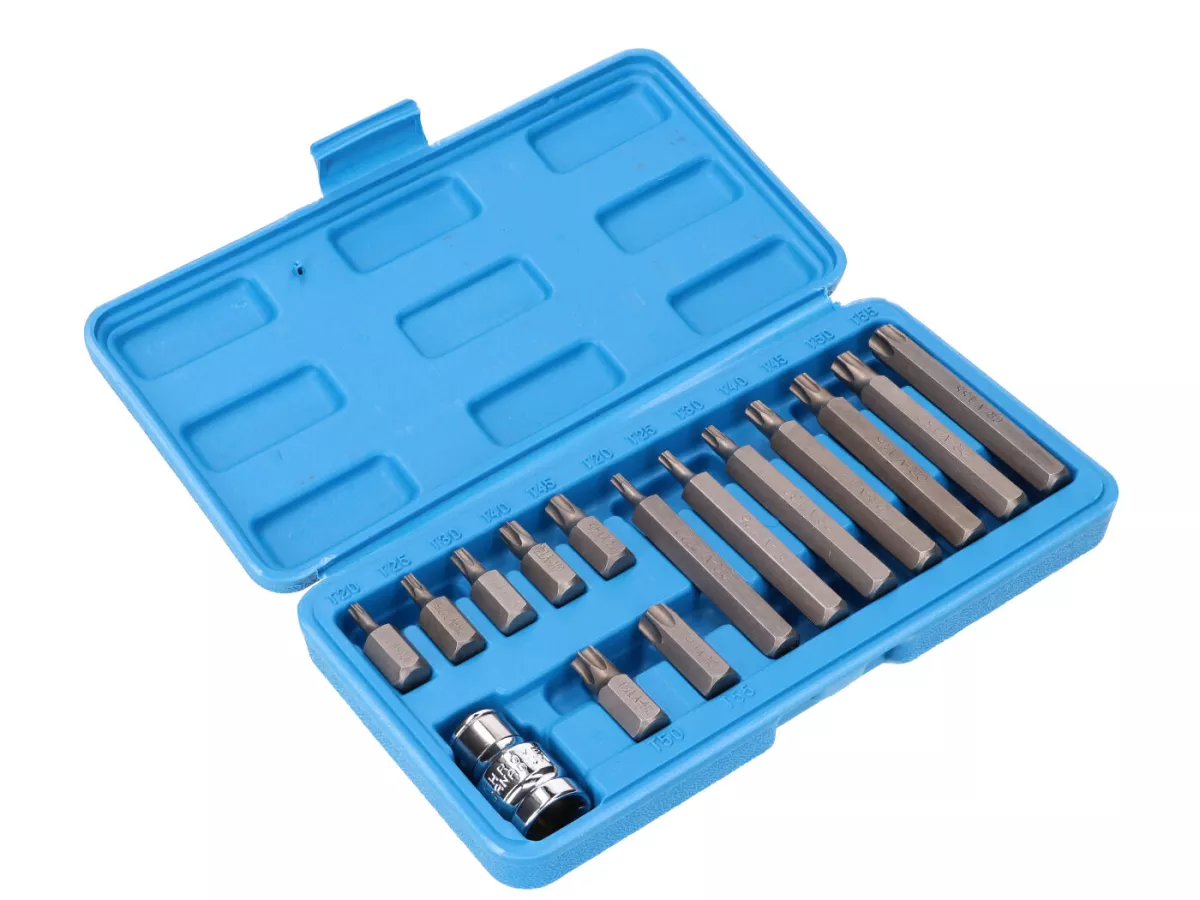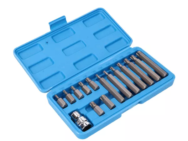 15-teiliger Satz TX-Schraubendrehereinsätze in verschiedenen Größen und in zwei Längen inklusive 1/2-Zoll-Steckschlüssel. Die Stecknuss besteht aus hochglanzpoliertem Chrom-Vanadium-Stahl. Die Schraubenziehereinsätze sind vergütet. Der praktische Aufbewahrungskasten sorgt für Ordnung und Übersicht.