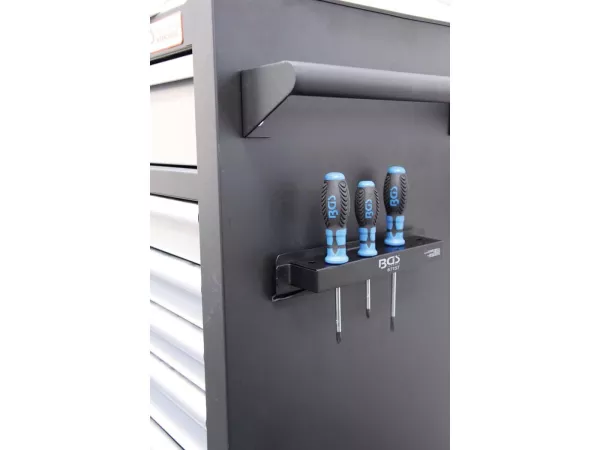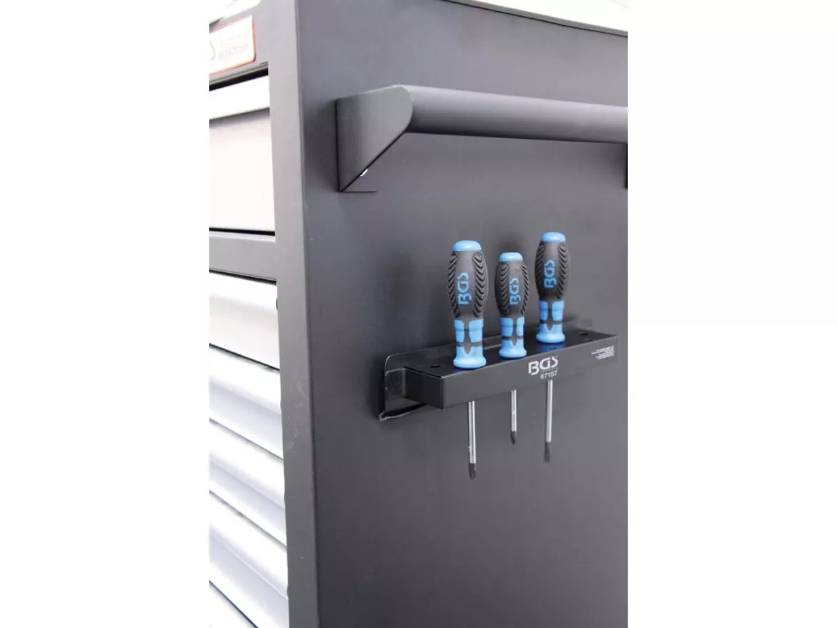 Dieser magnetische Schraubendreher-Halter organisiert deine Schraubendreher übersichtlich und platzsparend. Ideal für den Werkstattwagen oder die Werkbank. Die schwarze, pulverbeschichtete Oberfläche ist besonders robust und garantiert eine lange Lebensdauer