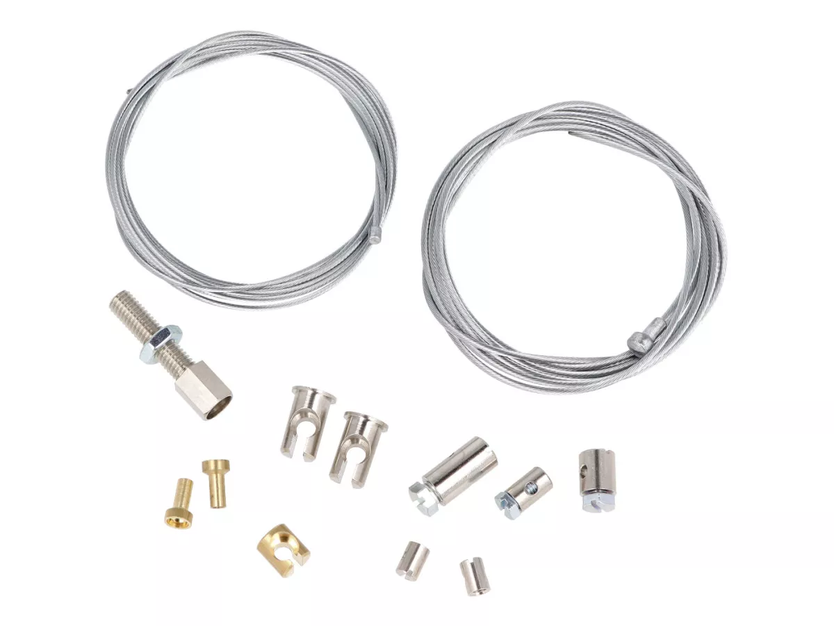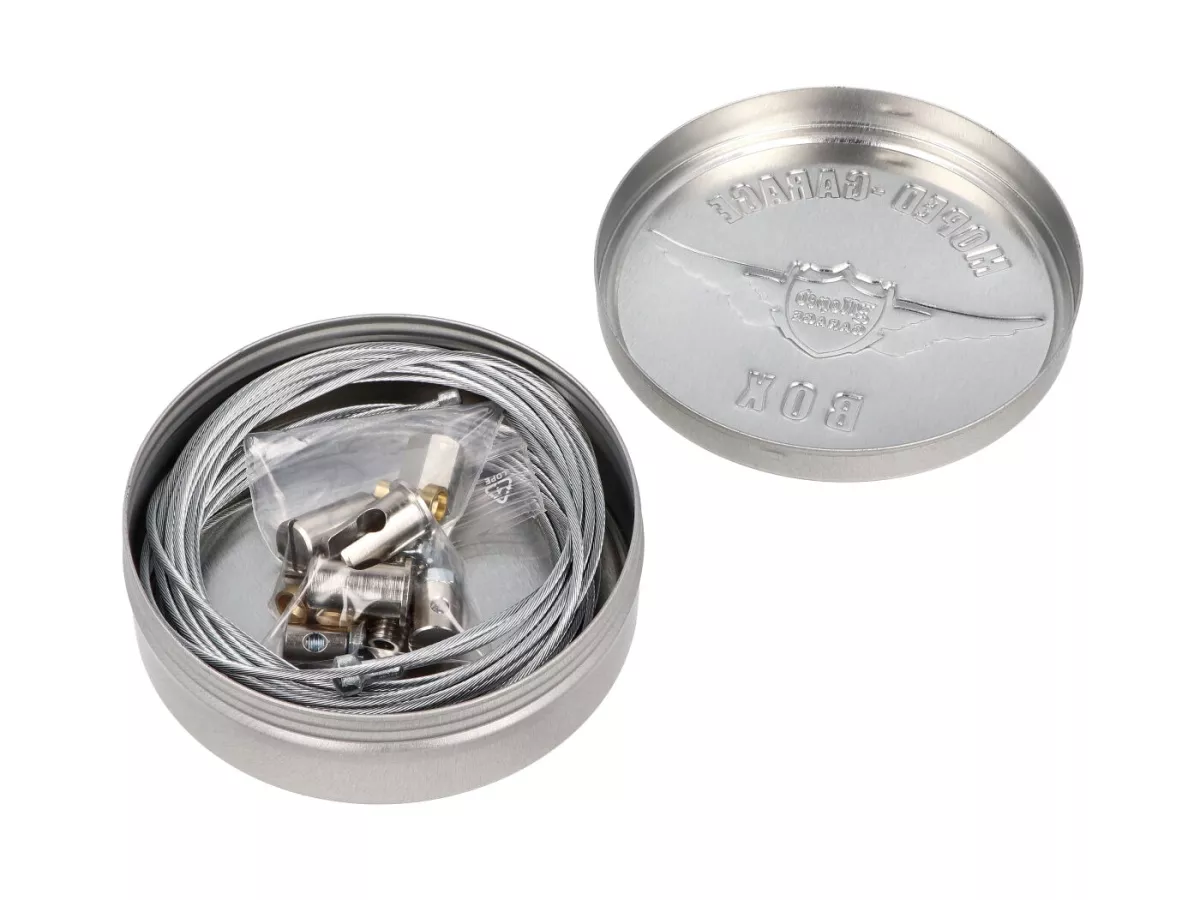 Universelles 14-teiliges Seilzug Reparatur Set mit Stellschrauben in einer Blech Box.