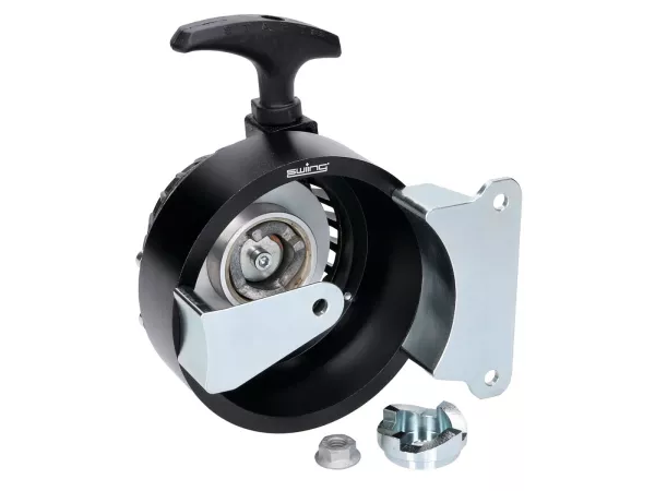 Schwarzer Seilzugstarter für Piaggio Ciao Modelle mit Mono- oder Variomatik-Antrieb. Einbaufertig. Der Zugstarter ist für den Rennsport und höchste Belastungen geeignet.