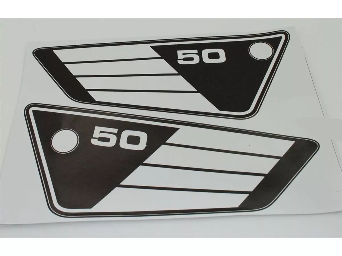 Seitendeckel Aufkleber Satz, Top Qualität, passend für Yamaha FS 1 Mokick Typ 3E9 Bj. 1980-1985, evtl. RD 50 nach Maßvergleich. Maße: 100mm H, 270mm L.