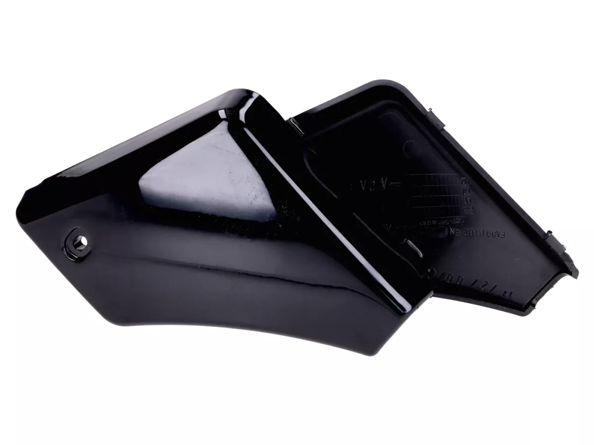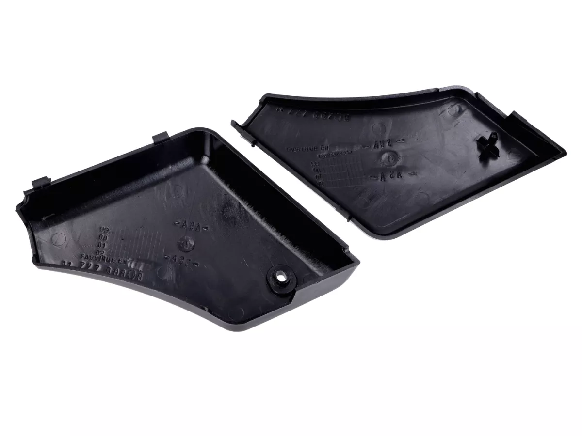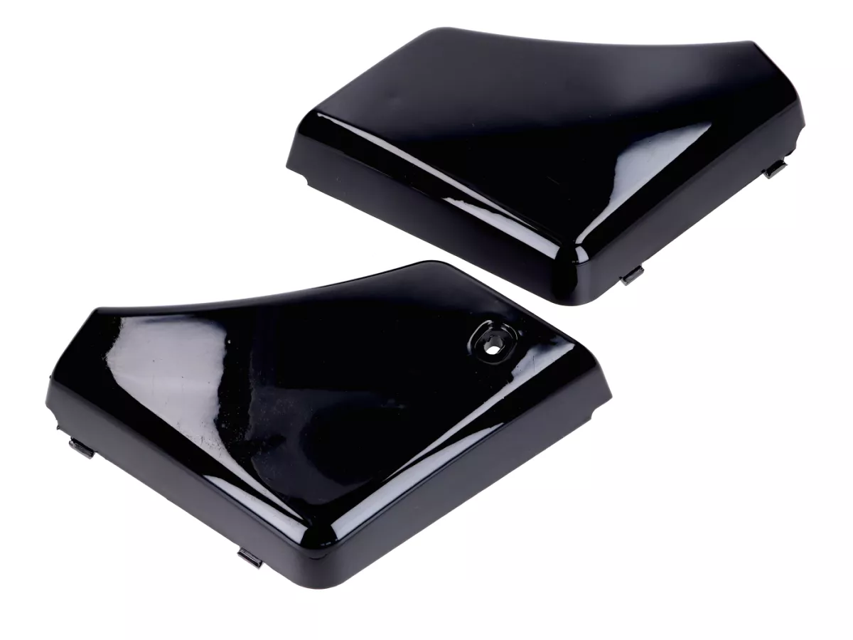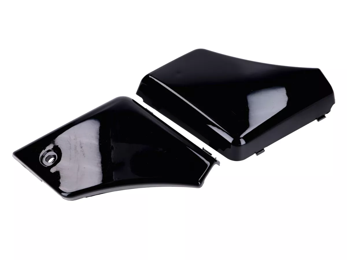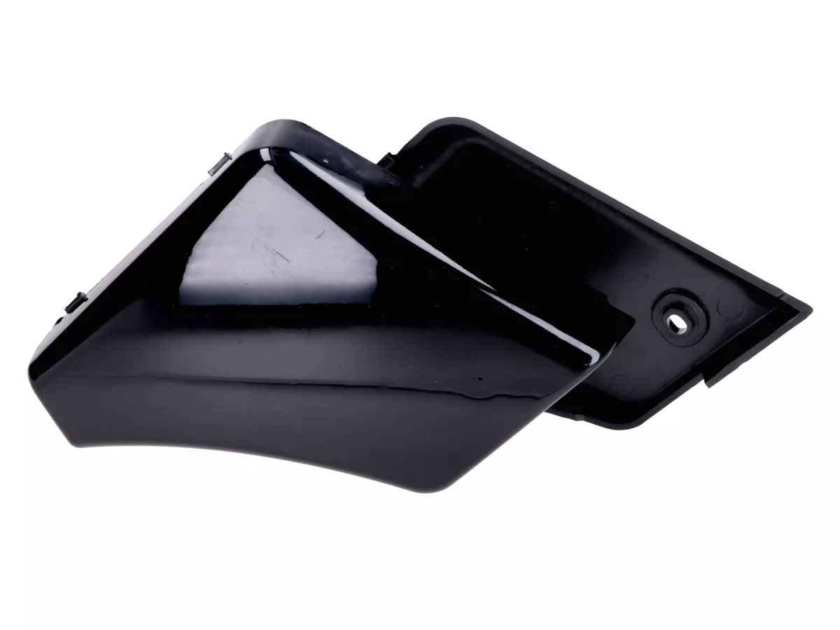 Seitendeckel Satz als Abdeckung für den Werkzeugkasten in Schwarz passend für Peugeot 103 SPX, Vogue. Der Satz besteht aus dem Deckel für die rechte und linke Seite.