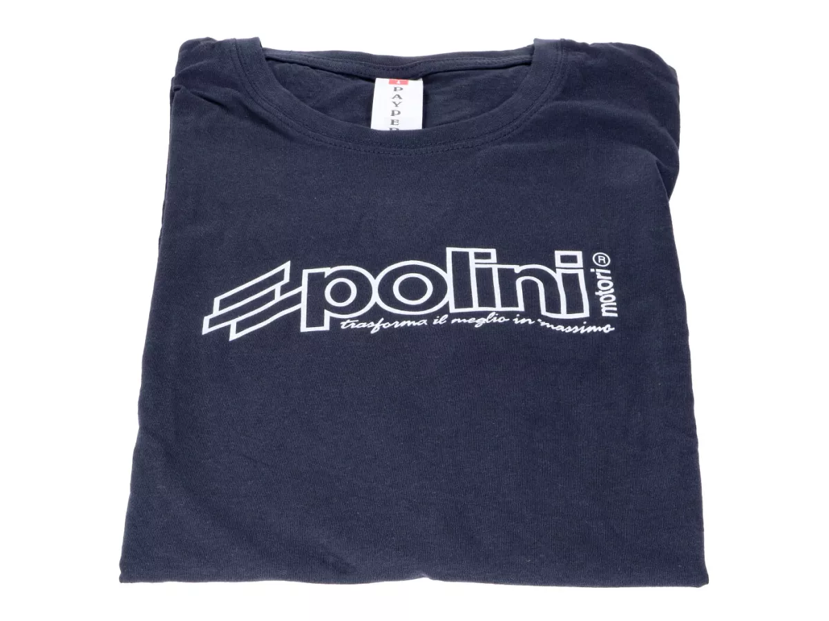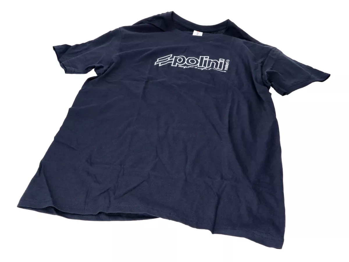 Blaues T-Shirt mit weißem Polini Logo. Größe L.