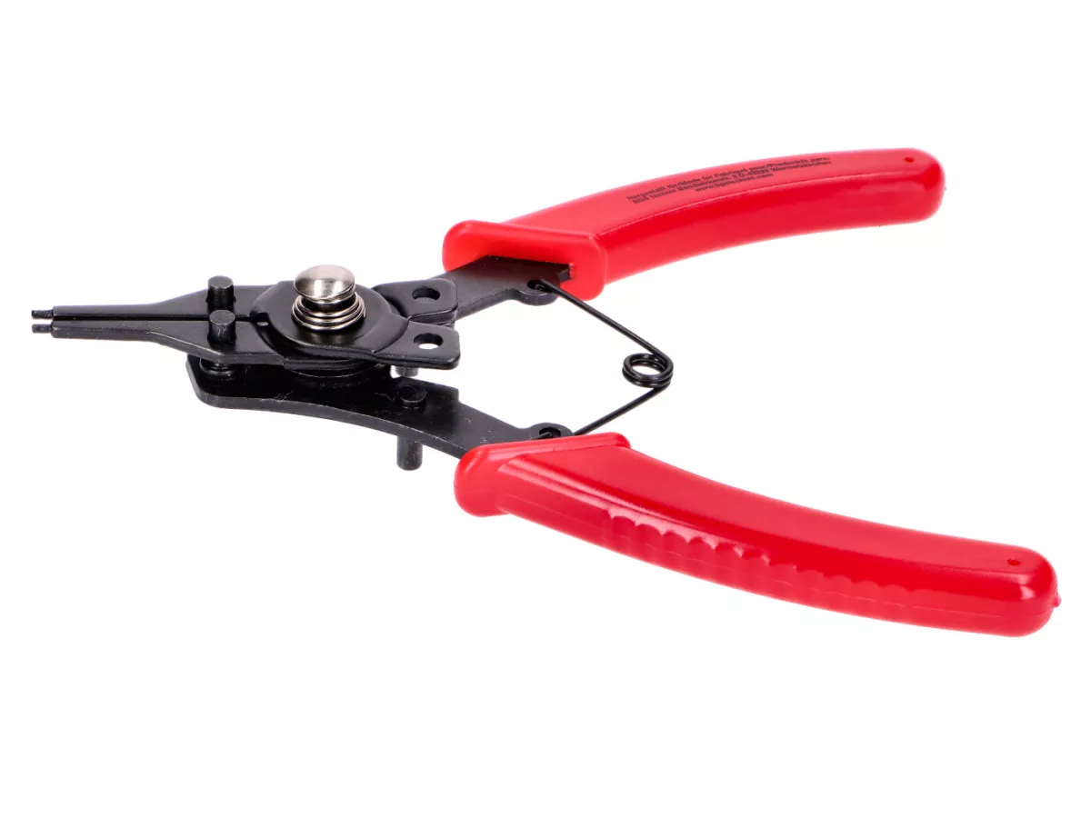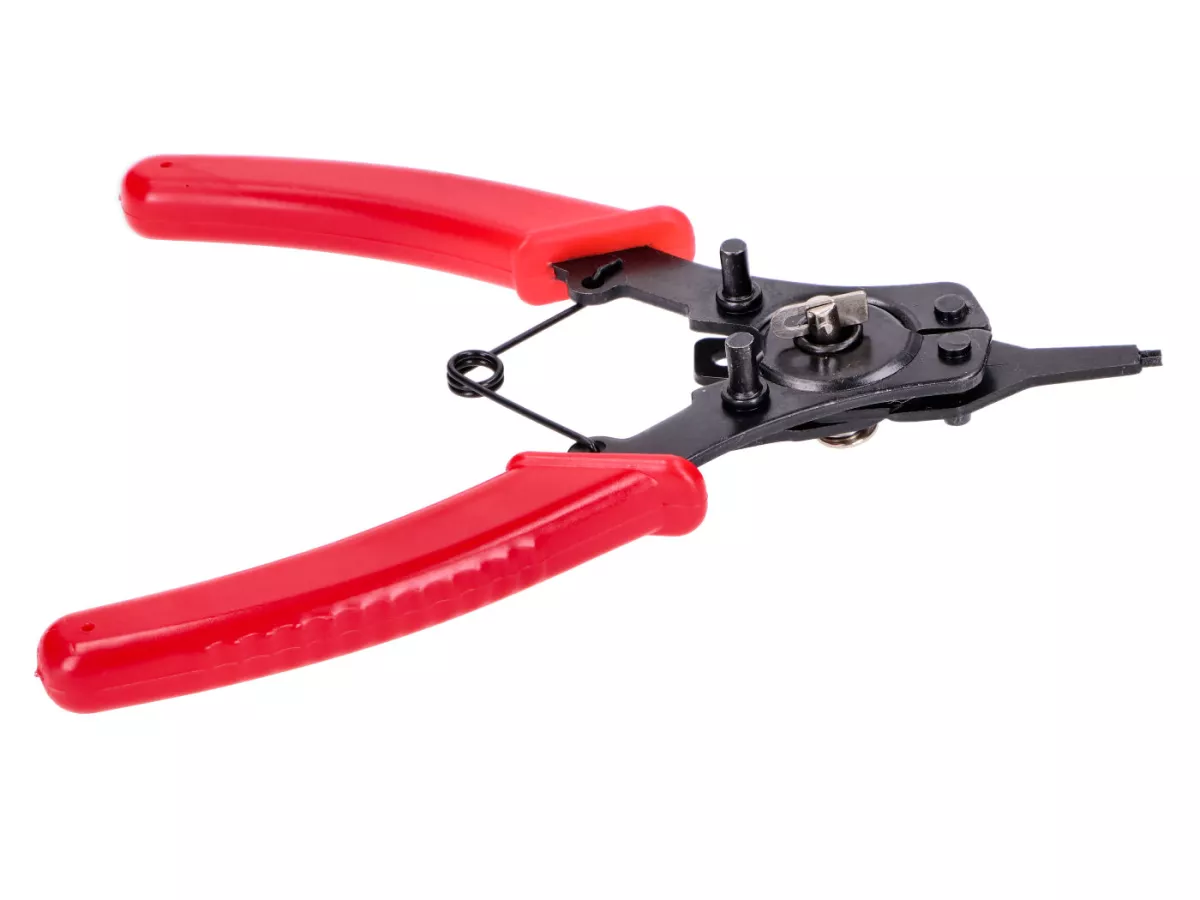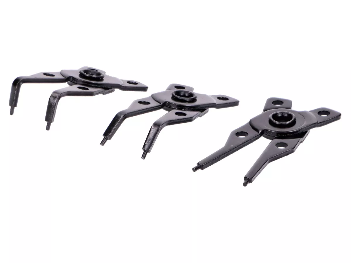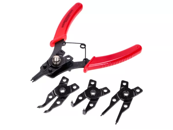Sicherungsringzange mit vier austauschbaren Backen im 5-teiligen Satz zum Befestigen und Entfernen von Innen- und Außenringen. Zange aus Chrom-Vanadium-Stahl mit Griffen aus Polypropylen. Die Griffe sind ergonomisch geformt und sind mit einem Abgleitschutz ausgestattet.
