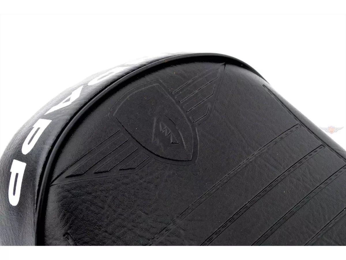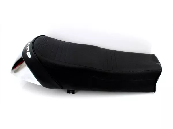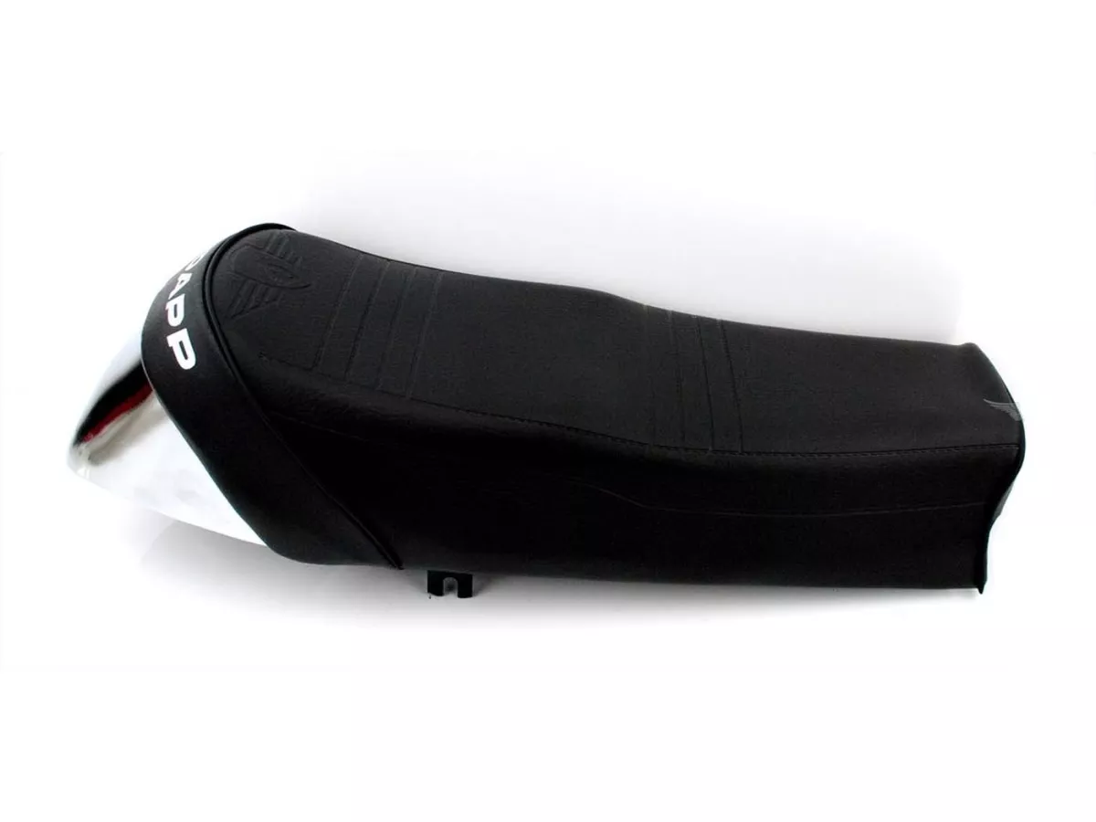 Custom Tuning Sitzbank mit Chrom Heckbürzel passend für Zündapp GTS 50, C 50, KS 50 Typ 517 und 529, erfordert kleine Anpassungsarbeiten. Schmale Tuning Sitzbank mit Metall Grundträger, Zündapp Flügel Logo eingestanzt und Zündapp Schriftzug in Weiß am Heck. Aussparung am Heckbürzel für Zündapp Tank Emblem (nicht im Lieferumfang enthalten). Maße: Länge gesamt ca. 650mm, Breite ca. 240mm, Höhe ca. 150mm, Befestigungsabstand hinten ca. 180mm, Befestigungsabstand vorne zu hinten ca. 305mm. 2. Wahl.