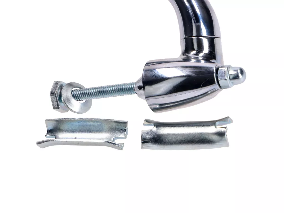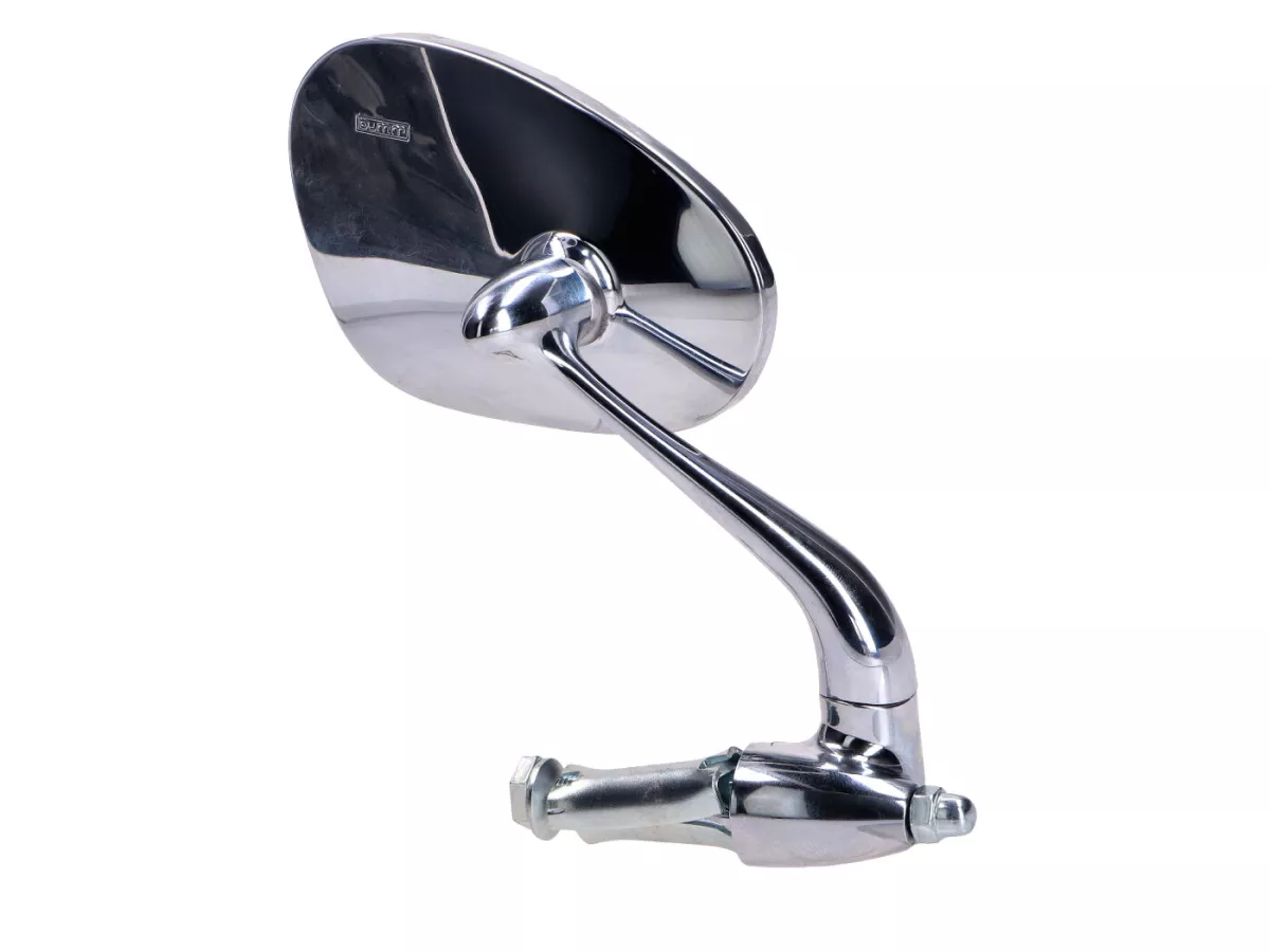 Verchromter Schwenkspiegel von Busch+Müller Typ 913/3 VR für die rechte Seite, mit Innenklemme, massive Ausführung. Der ovale Lenkerendenspiegel ist universell passend für alle Lenker mit 22mm Durchmesser.