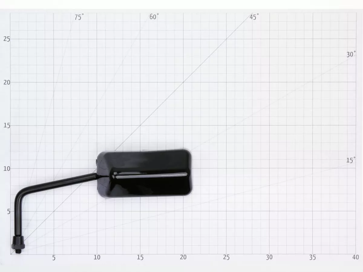 Schwarzer Spiegel im F1 Design mit kurzer Halterung zur Links- sowie Rechtsmontage. Der Spiegel verfügt über ein Rechtsgewinde, das durch einen Adapter auf Linksgewinde umgerüstet werden kann.