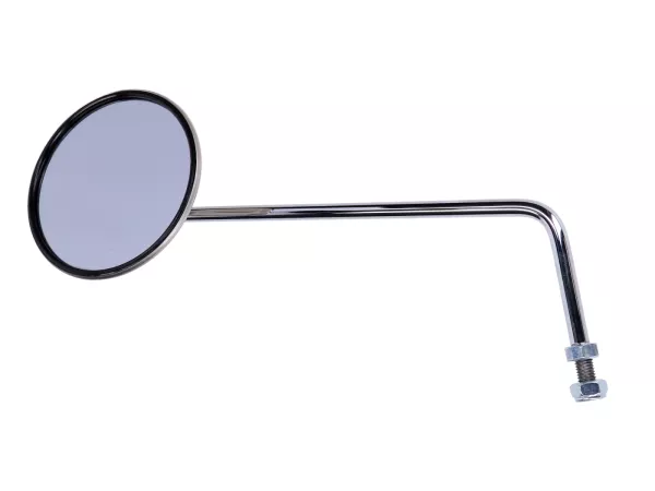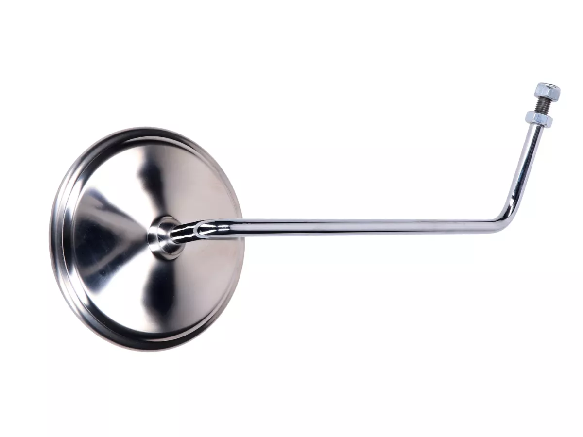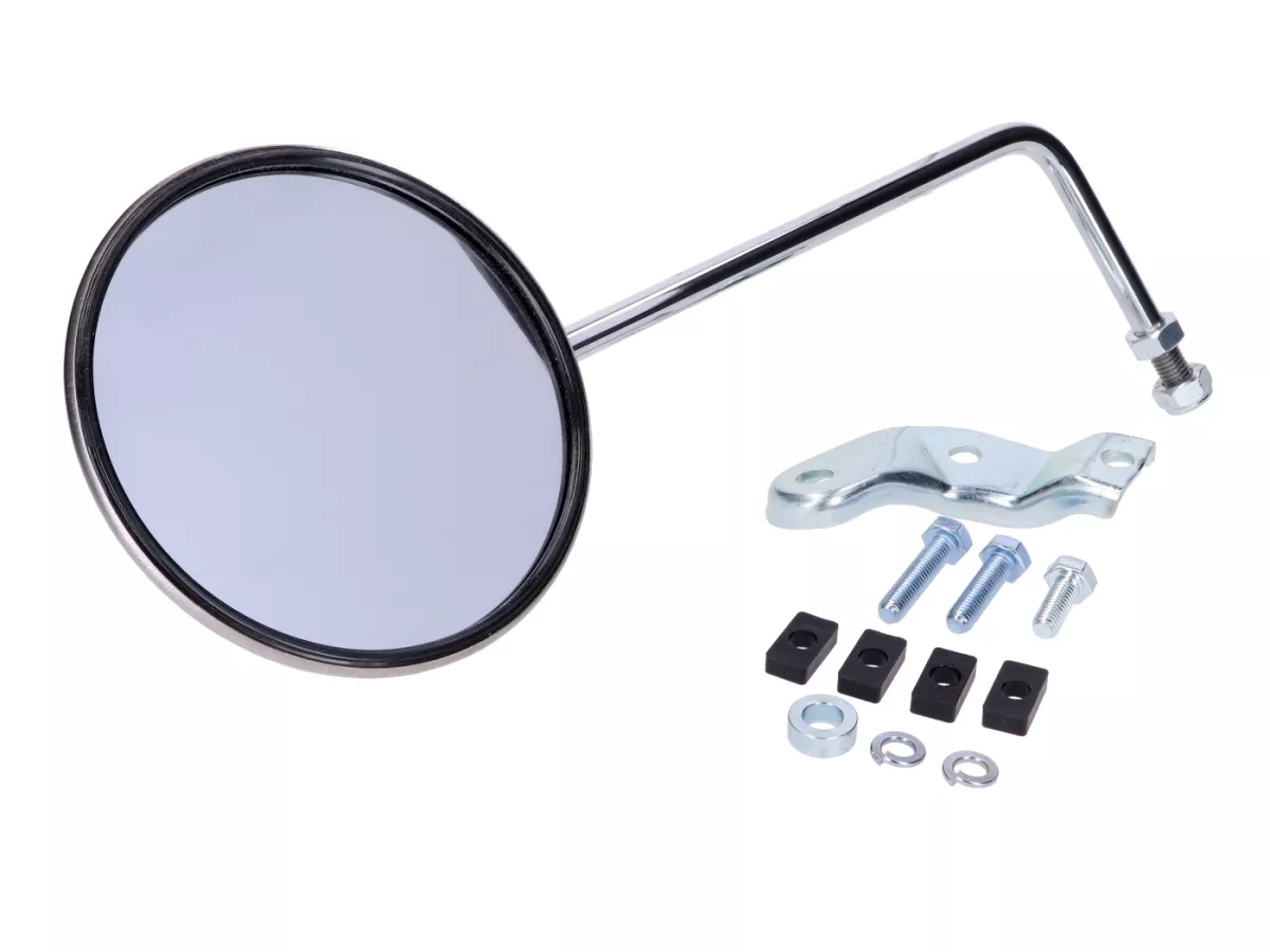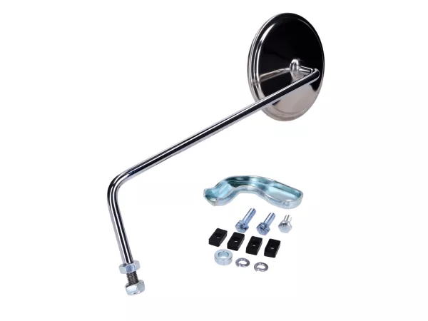 Der runde linke Spiegel mit Halter aus Edelstahl wurde speziell für Piaggio und Vespa PX Roller konstruiert. Das hochwertige Material Edelstahl gewährleistet Korrosionsbeständigkeit und Langlebigkeit unter allen Witterungsbedingungen. Der Spiegel ist präzise gefertigt und bietet eine optimale Sicht nach hinten, wodurch die Fahrsicherheit signifikant erhöht wird. Die Befestigungshalterung ist robust und passgenau ausgelegt, um eine sichere Montage am Lenker des Rollers zu gewährleisten. Dieses Ersatzteil kombiniert Funktionalität mit ästhetisch klarer Formgebung, die sich harmonisch in das klassische Design des Vespa PX einfügt.