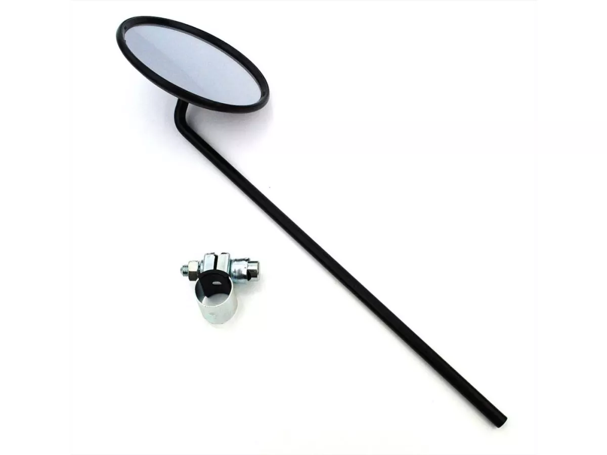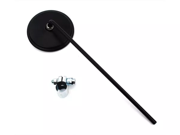 Schwarzer bumm Spiegel mit Schelle zur Lenkerbefestigung, universell passend für Links oder Rechts. Geeignet für viele Mofa, Mokick und Moped Modelle wie Zündapp, Kreidler, Hercules, Miele, DKW, NSU, Horex, Puch, Gritzner usw. Kopf Durchmesser ca. 110mm, Länge der Stange ca. 290mm, Schelle passend für alle 22mm Lenker. Verkleinerndes Glas, Farbe: Mattschwarz. Top Qualität vom Erstausrüster, Made in Germany.