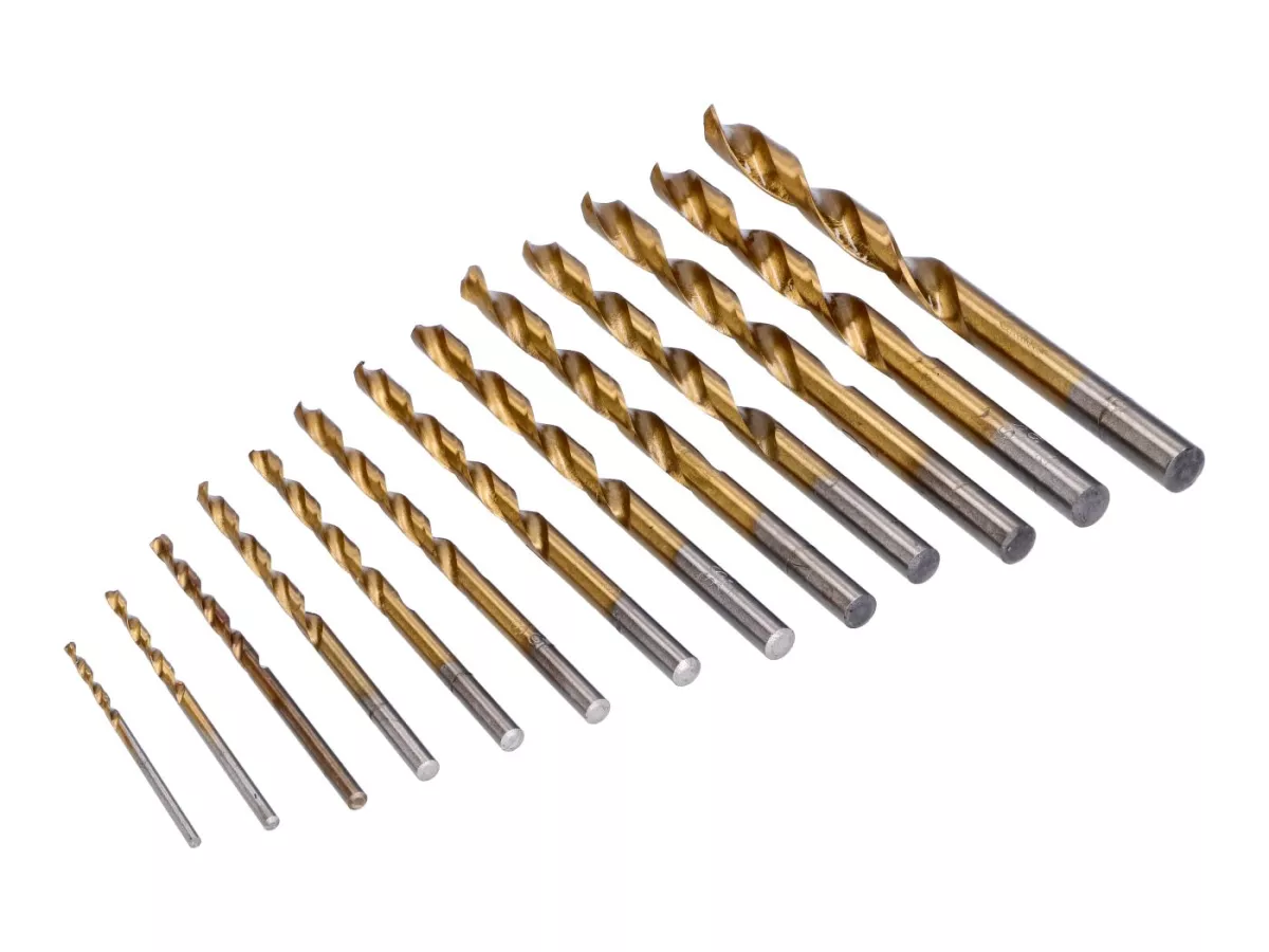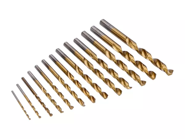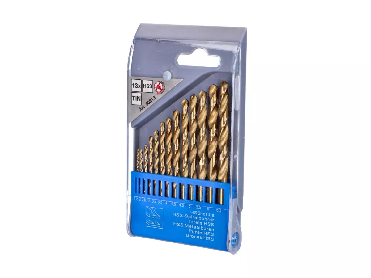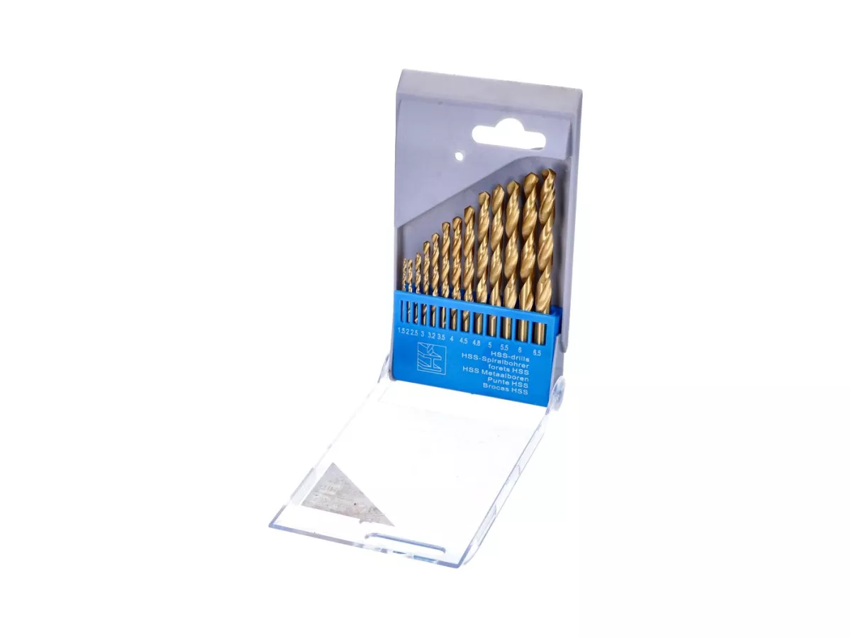 13-teiliger Satz HSS-Spiralbohrer in stabiler Metall-Aufbewahrungskiste. Für NE-Metalle, Stahl, Aluminium, Holz und Kunststoff geeignet.