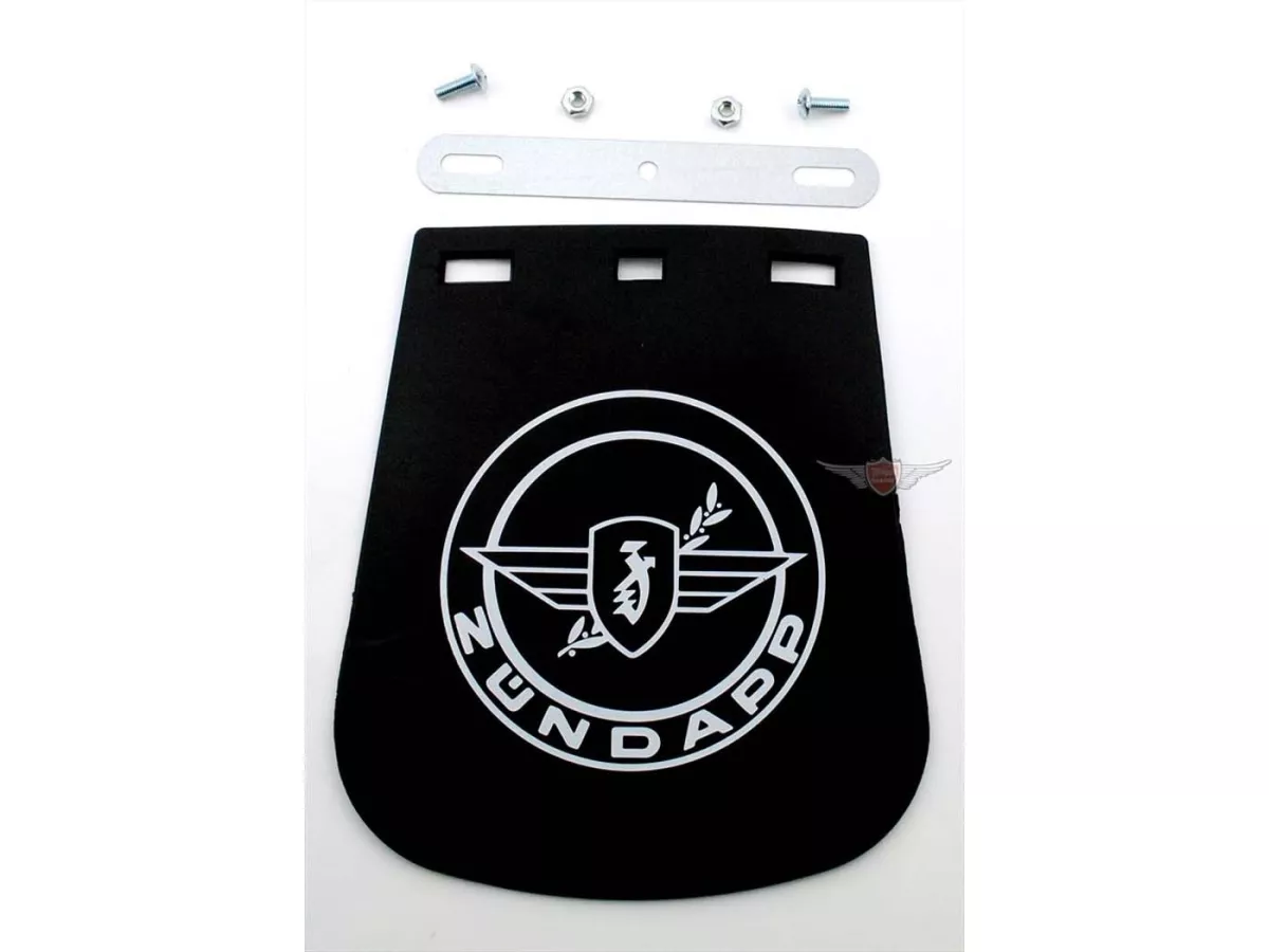 Spritzlappen mit Zündapp Emblem passend für Zündapp GTS, KS, C, CS, CX, Hai, ZD. Maße: Breite oben ca. 120mm, Breite unten ca. 140mm, Höhe ca. 165mm, Befestigungslochabstand ca. 85 bis 95mm.