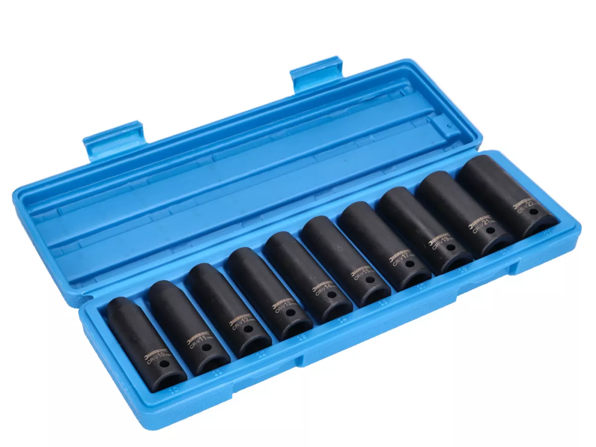 10 metrische Sechskant-Steckschlüssel mit 1/2-Zoll-Antrieb im praktischen Sortimentskasten, lange Variante. Spezielle dickwandige Konstruktion für die Verwendung mit Schlagschraubern und für hohe Drehmomente. Die Steckschlüssel bestehen aus kalt geschmiedetem, vergütetem Chrom-Vanadium-Stahl. Korrosionsschutz durch Phosphatierung. Die Größenangaben sind durch Lasergravur leicht zu erkennen.