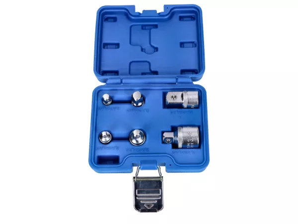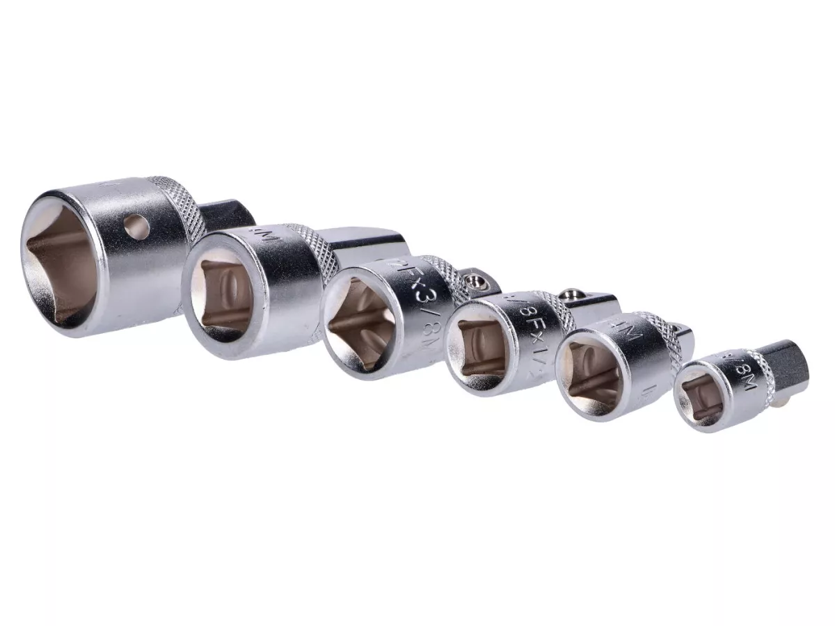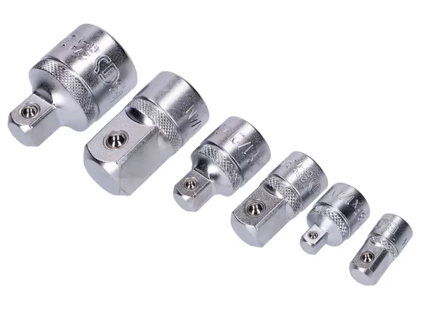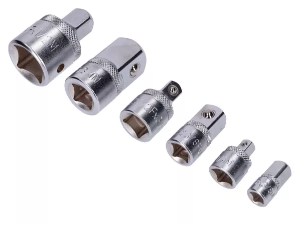 Nützlicher 6-teiliger Satz Steckschlüsseladapter mit Aufbewahrungsbox. Diese vernickelt-verchromten und damit korrosionsgeschützten Adapter bestehen aus hochglanzpoliertem, vergütetem Chrom-Vanadium-Stahl.