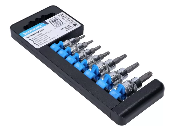 7-teiliger Satz Steckschlüssel mit 1/4-Zoll- und 3/8-Zoll-Antrieb und passenden TX-Bits von T10 bis T40. Praktische Kombination aus Vierkant-Steckschlüsseleinsätzen aus poliertem Chrom-Vanadium-Stahl und vergüteten, satinierten TX-Bits.