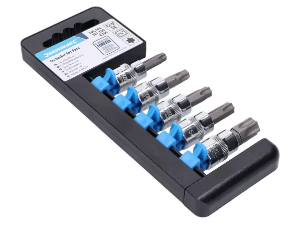 5-teiliger Satz Steckschlüssel mit 3/8-Zoll-Antrieb und passenden TX -Bits in verschiedenen Größen von T40–T60. Vierkant-Steckschlüsseleinsätze aus poliertem Chrom-Vanadium-Stahl in Kombination mit vergüteten, satinierten TX-Bits.