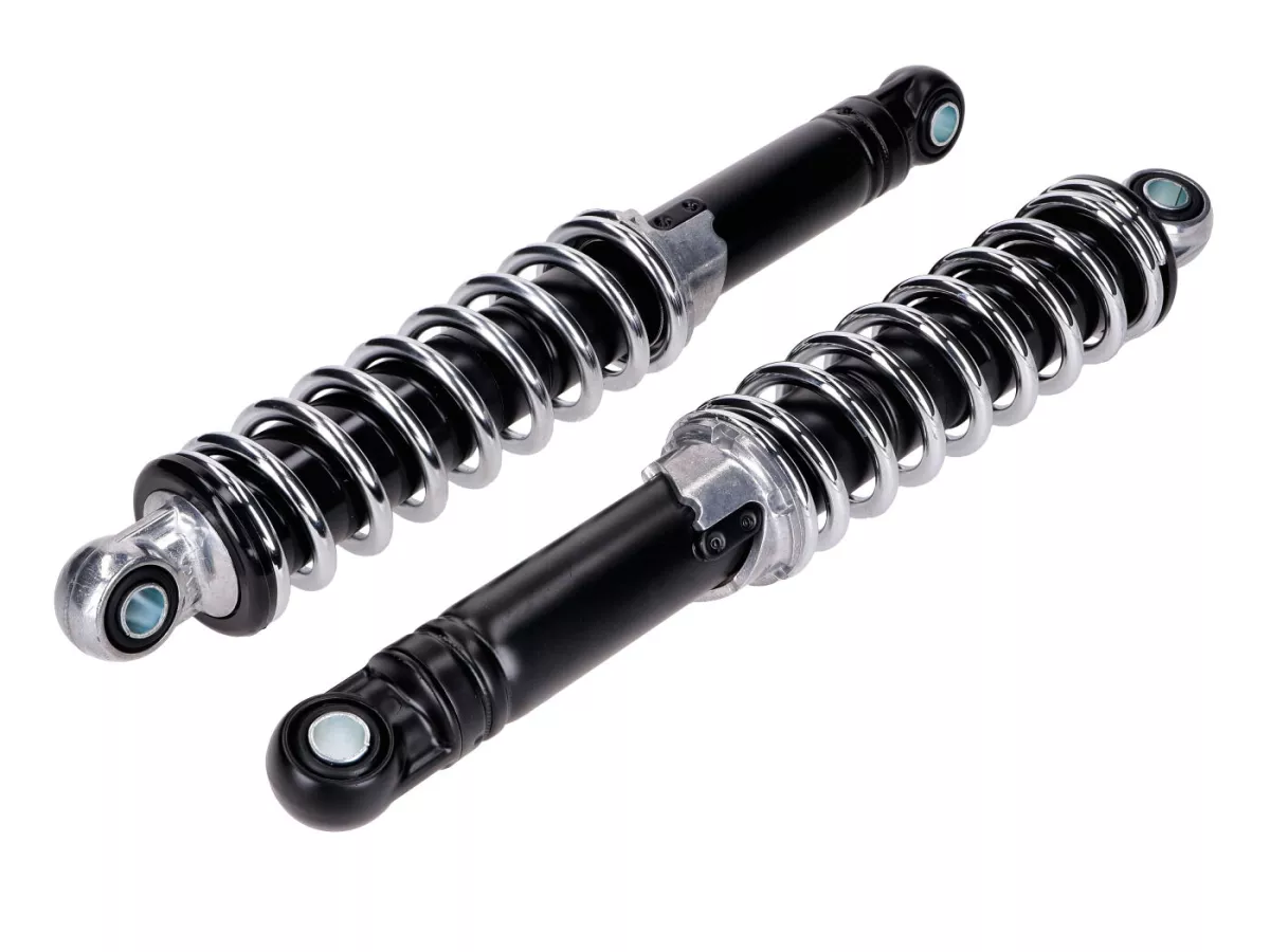 Ein Satz einstellbare 280mm Sport Federbeine in Top Qualität, hergestellt in Italien, passend für Zündapp, Kreidler, Hercules, Puch, DKW, Rixe, Sachs, KTM Mofa, Moped und Mokick. Länge von Auge zu Auge gemessen, Befestigungslöcher mit 10mm und 8mm Durchmesser.