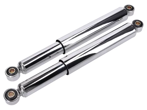 Ein Paar Stoßdämpfer mit Chrom-Finish. Die Dämpfer sind in klassischer, geschlossener Optik ohne äußerlich erkennbare Spiralfeder ausgeführt. Das ergibt einen sehr edlen Vintage Look.