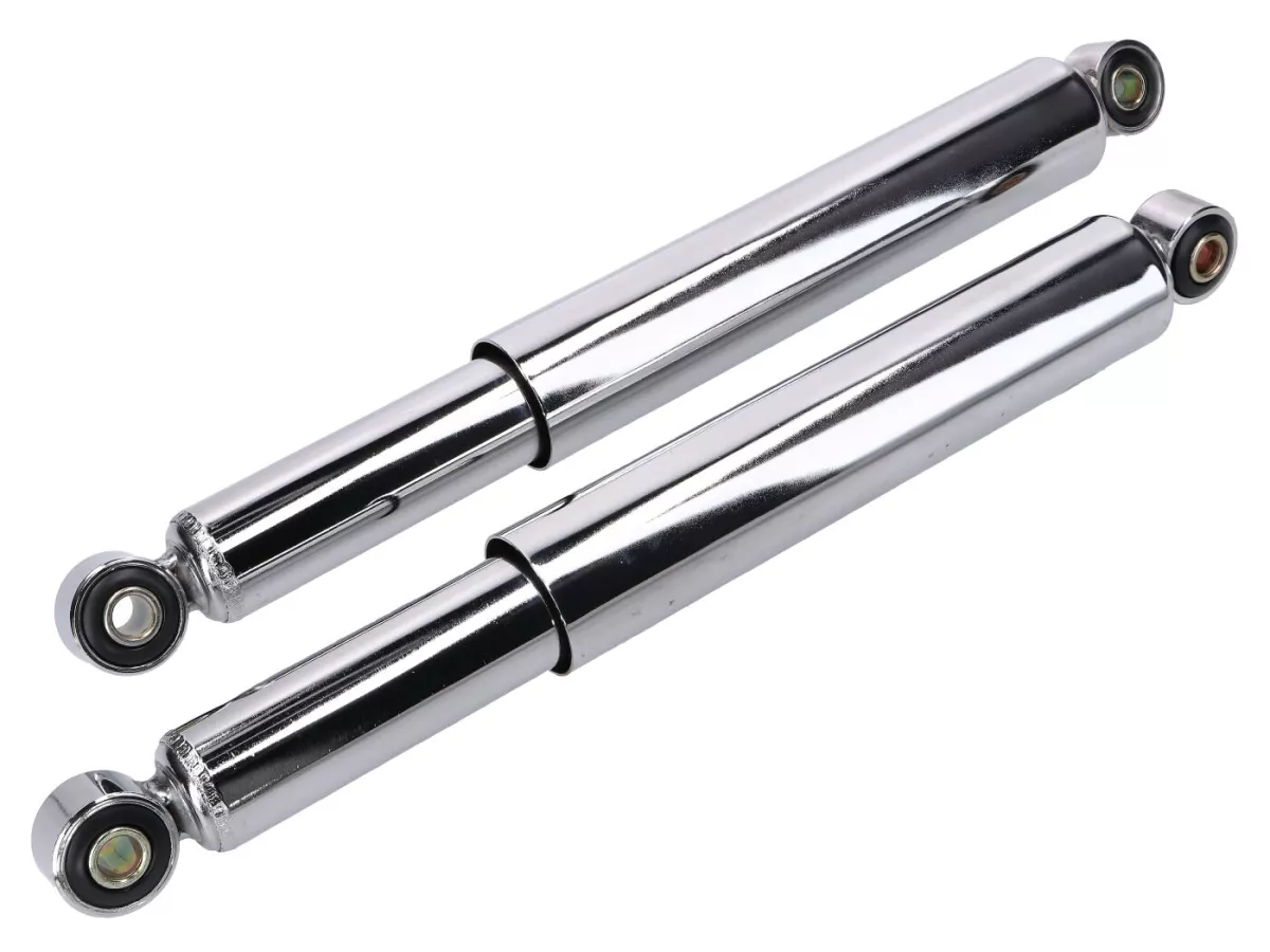 Ein Paar Stoßdämpfer mit Chrom-Finish. Die Dämpfer sind in klassischer, geschlossener Optik ohne äußerlich erkennbare Spiralfeder ausgeführt. Das ergibt einen sehr edlen Vintage Look.